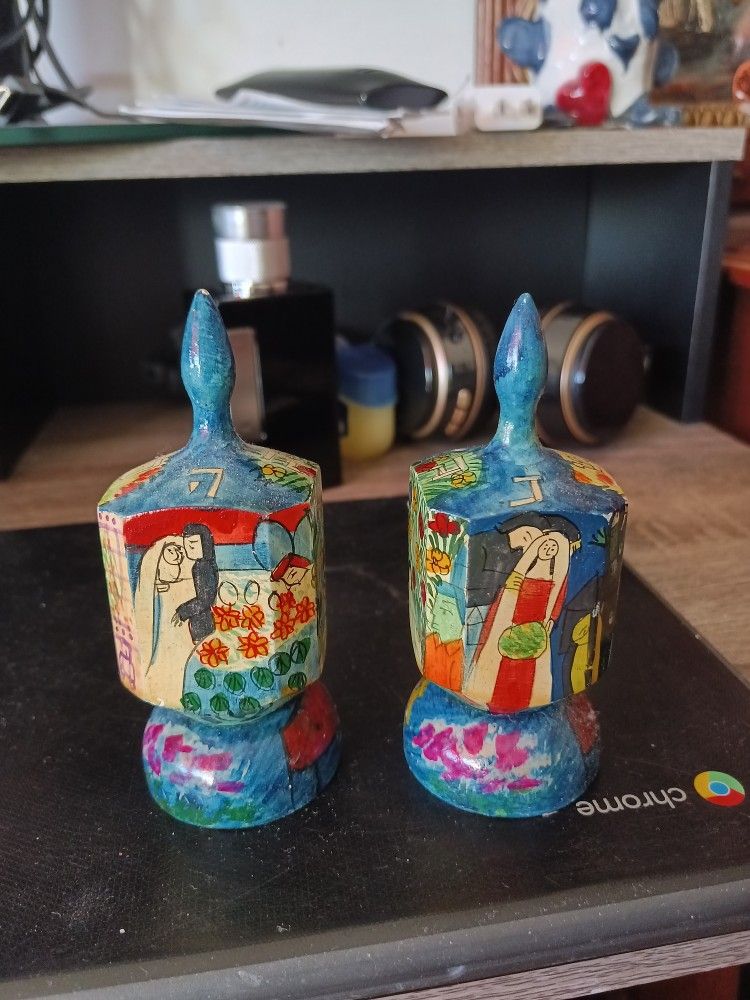 Figures in White Hand Painted Large Wooden Dreidel and matching Stand by Yair Emanuel