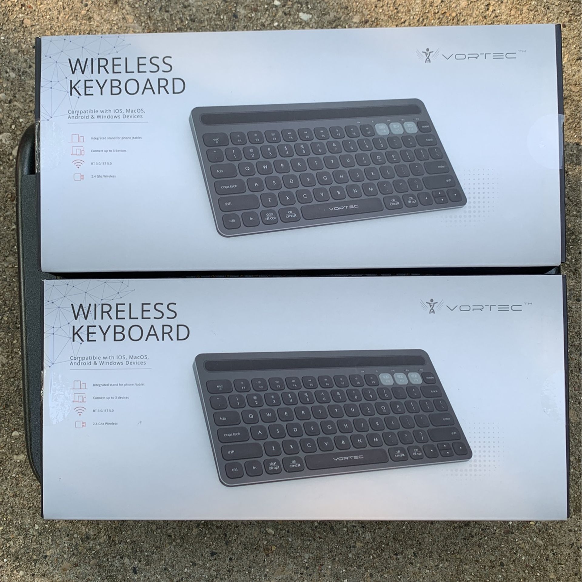 The items are new and in the box. $10 each. Compatible with iOS, MacOS, Android & Windows Devices Integrated stand for phone/tablet J Connect up to 3 devices BT 3.0/ BT 5.0 2.4 Ghz wireless