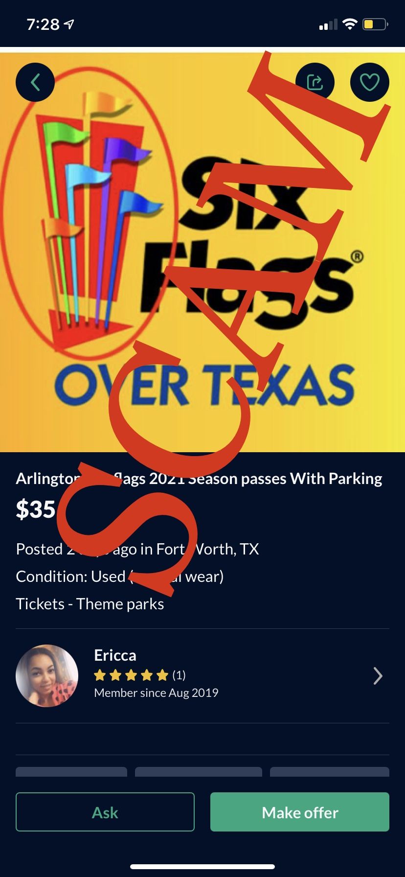 **BEWARE!!**SCAM!!SCAM!!SCAM!!**BEWARE!!** This is a guy not a female, selling “season passes”. Asks you to pay through cash app, Apple Pay, zelle. Says he has employee discount. Gives you digital passes through the app that look legit. We went to six flags, passes scanned as invalid, sent to guest services where they told us these were unauthorized resale passes. Had to go home with disappointed kids.