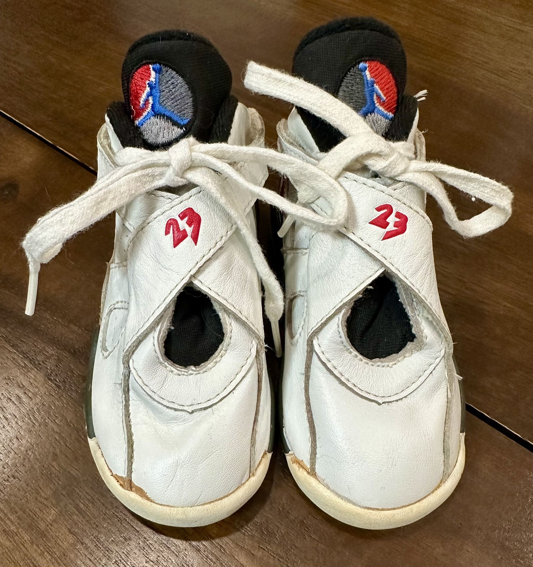 1993 vintage/retro Nike Air Jordan 23 sneakers for babies/toddlers. Size 7, white with black/red/grey accents. Lace ups with Velcro straps. Style 150164. Worn a few times as a baby but otherwise in near excellent condition with normal aging on the leather (see photos).