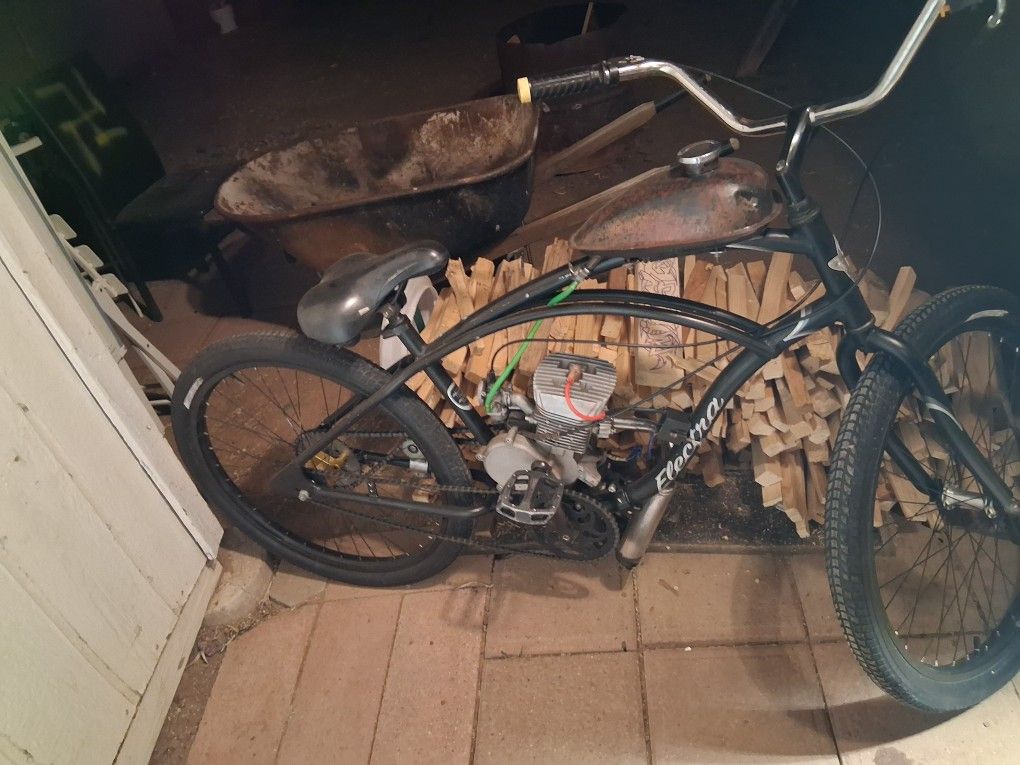Clean men's Electra 26" frame Brand new treads front&back China doll engine kit few upgrades like shark head,brand new cnc rear hub sprocket mount, 36t sprocket! Brand new Cnc front motor mount... all around fun and very reliable bike for beginners or experienced riders. Runs great no issues at all. Asking only $300.00 for this one. I have multiple others if interested look @ my posted items if it's still up then yes i still have it. Thanks