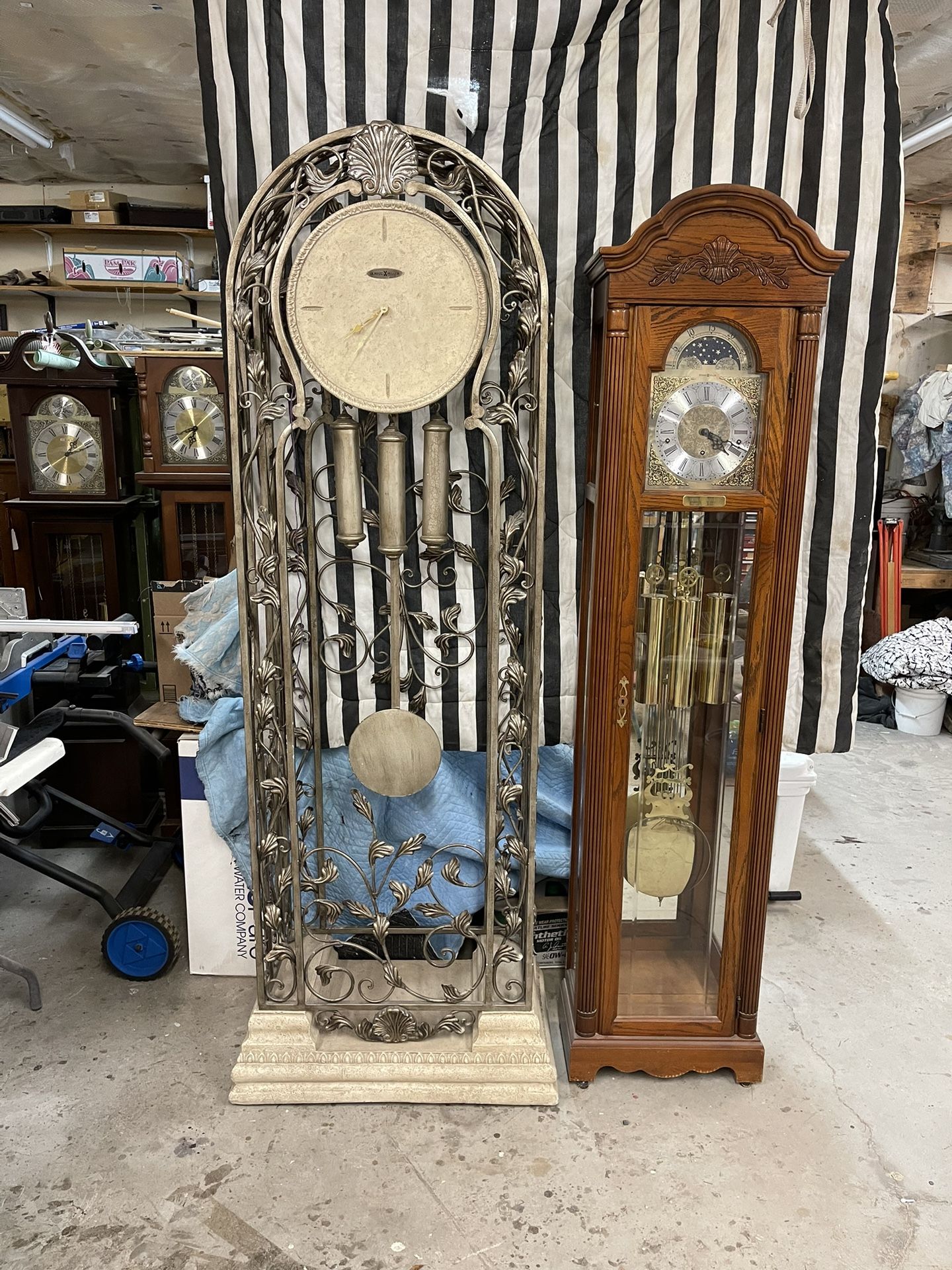 Steel one is brand new. Does (not) chime. Just tells the time always in time! $500. Howard Millar mechanical driven grandfather clock. Completely gone through and serviced properly. Excellent sound on chimes and accurate time piece. $600.