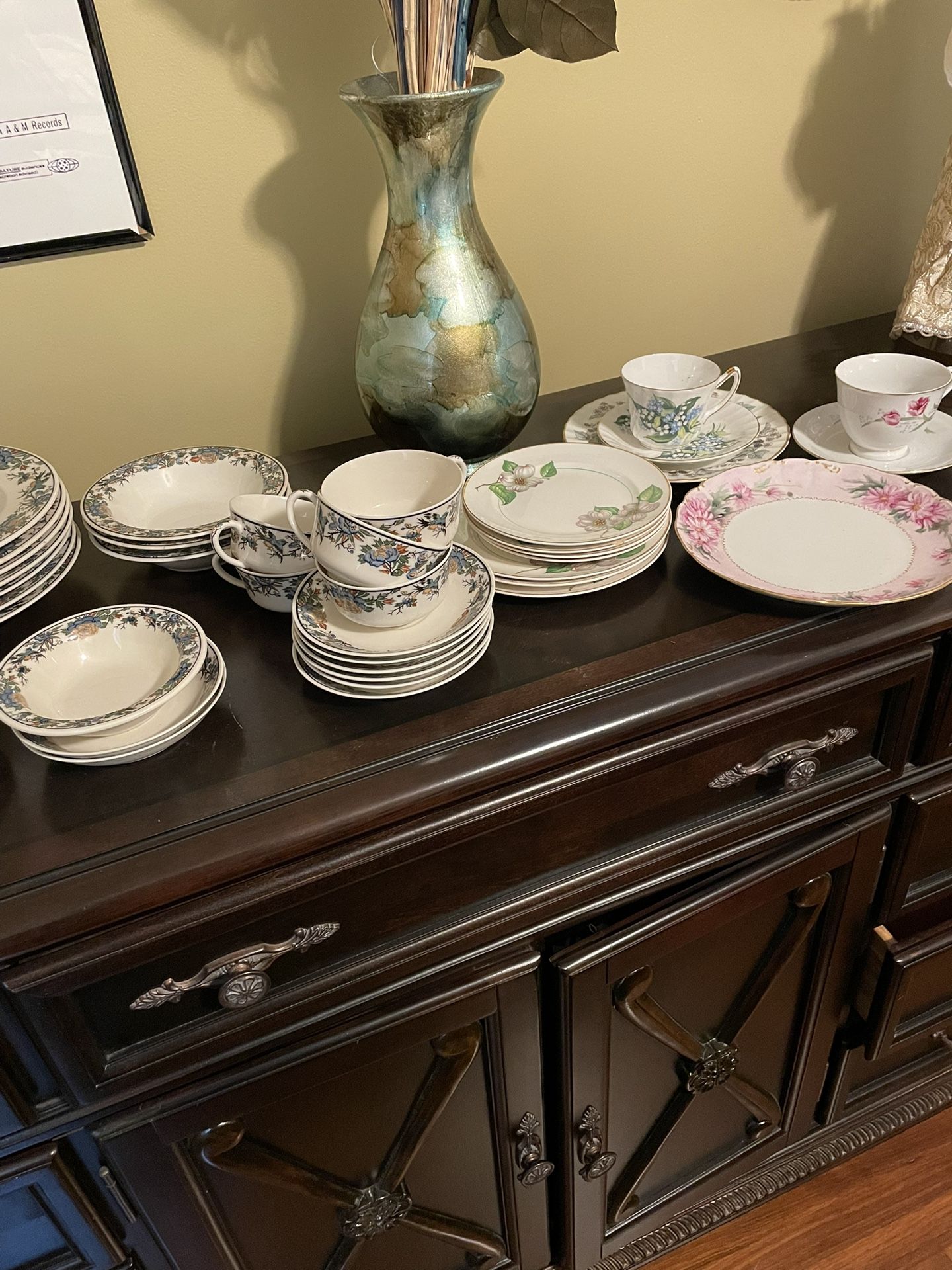 This is a lot of used antique china from the early 1900s. It contains pieces from the following: Tapestry by Syracuse, Lavinia by Royal Worcester, Pope Gosser dogwood pattern. There are approximately 45 pieces.