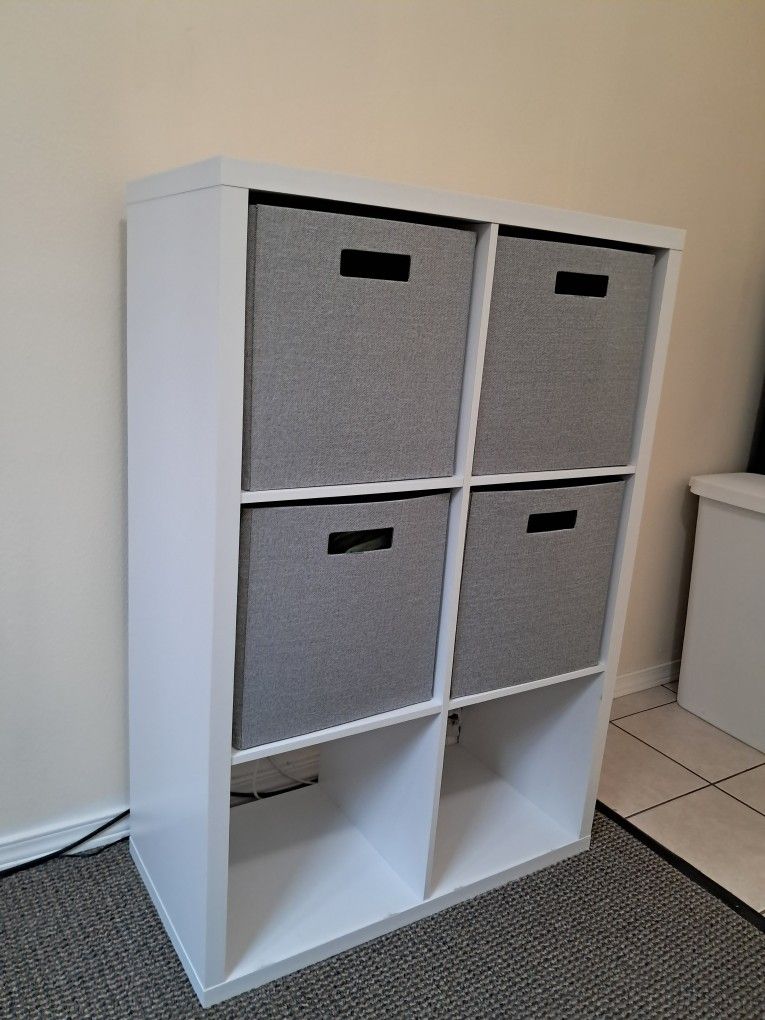 Almost new, used for about a few months, 13'' 6 Cube Organizer White. Decorative Bookshelf, Cubby Storage, MDF & Particle Board, 13" System Compatible. Plus free, cylinder lamp and tiny cute next to bed table.