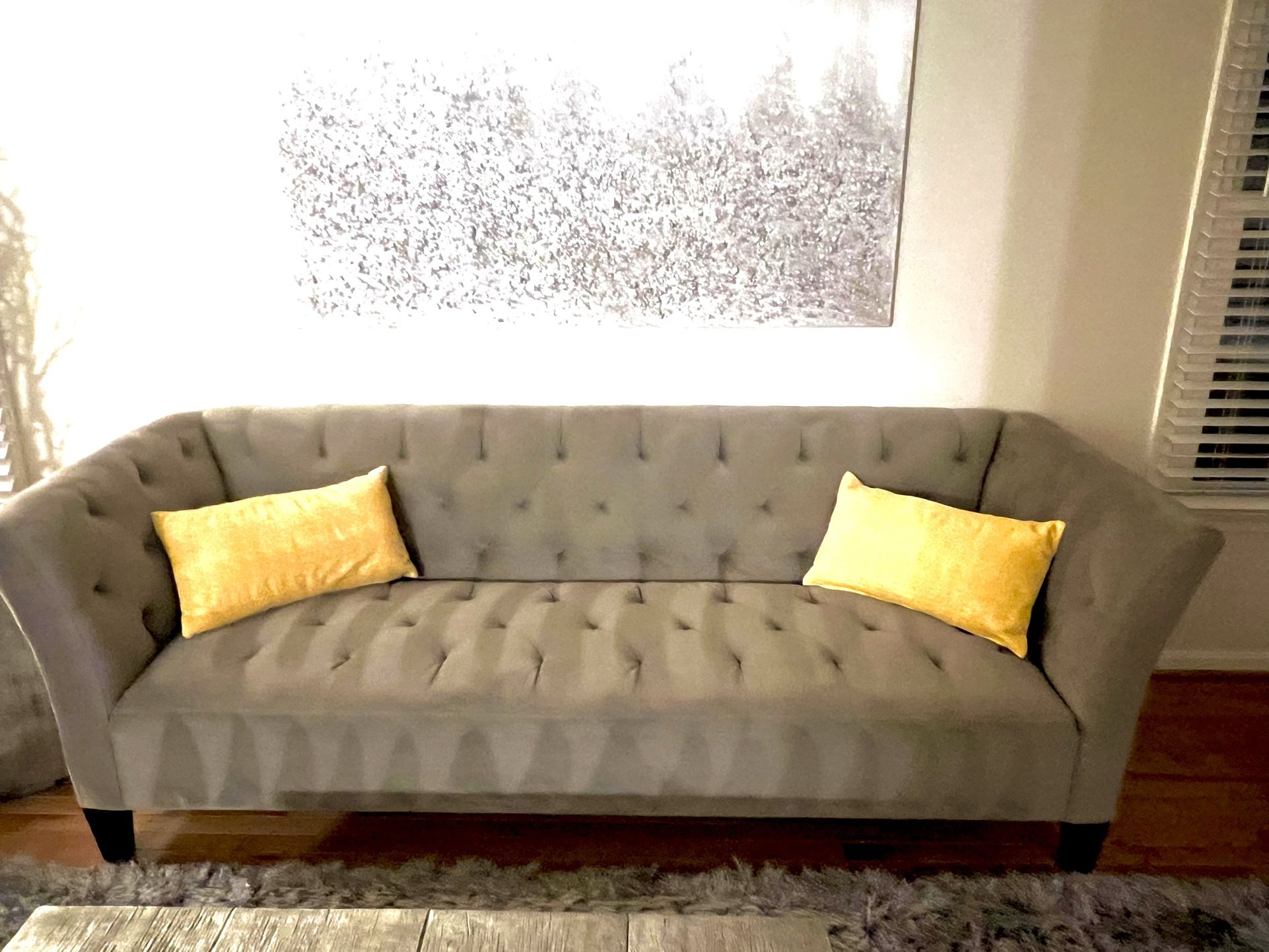 Barely used gorgeous set of gray sofas with ottoman and 8 matching dining room chairs. We also have an area rug for the dining room and living room room for sale. In addition to these items, we also have some artwork for sale.