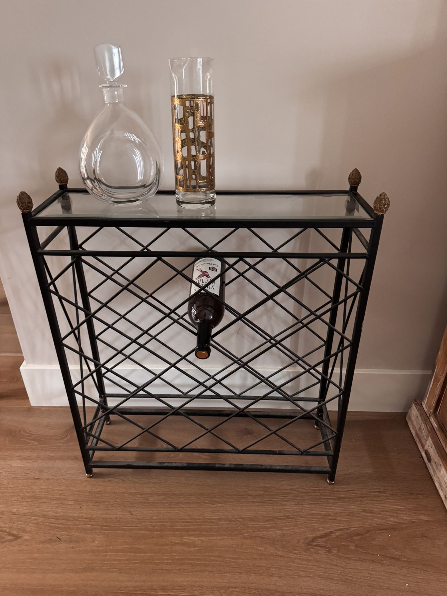 Beveled glass top . Gold finials. Holds 25 bottles. Items in first photo for staging only. $30 wine rack.