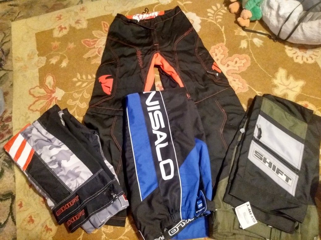 Green shift size28 never warn 75$ Red/BLK Thor size30 like brand new 75$ Why/red/gray camo shift size28 lightly used some slight damage on right lower leg 55$ Blue/BLK sisisalo size28 used but look new 55$ over $500.00 in pants $175.00 takes all Cal or txt "nine2five"4two1" 35two6