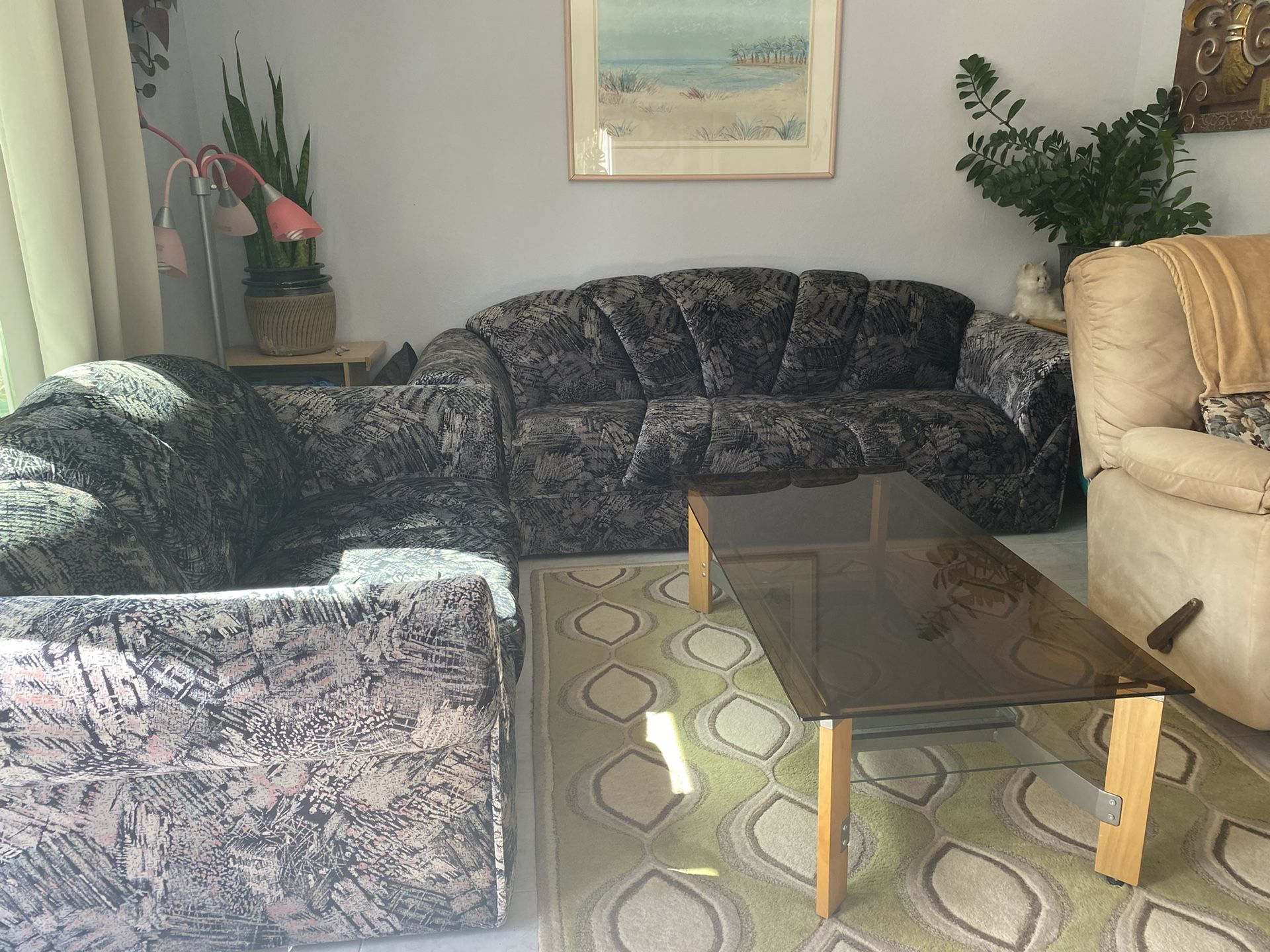 Selling a living room furniture set in good condition. Includes: • 2-piece couch set • reclining chair • Glass coffee table Selling because we are upgrading our furniture. Pickup only.