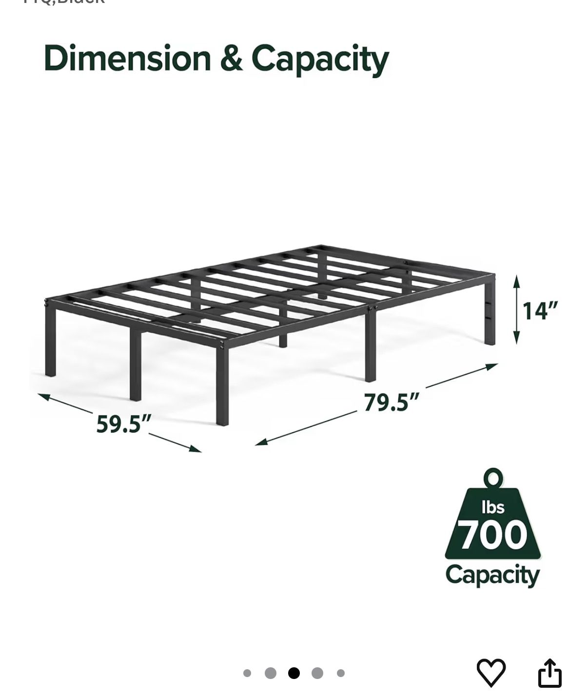 • Size: Queen • Dimensions: 60" x 80" x 14" • No Box Spring Needed: Strong steel slats provide direct support for any memory foam, hybrid, or inner-spring mattress. • Massive Storage: The 14-inch height provides roughly 12 inches of clearance underneath—perfect for tucking away suitcases, bins, or extra linens. • Heavy Duty: Built with a reinforced steel frame for maximum stability (no squeaking). • Recessed Legs: The outer legs are slightly recessed for safety to help prevent you from stubbing your toes.