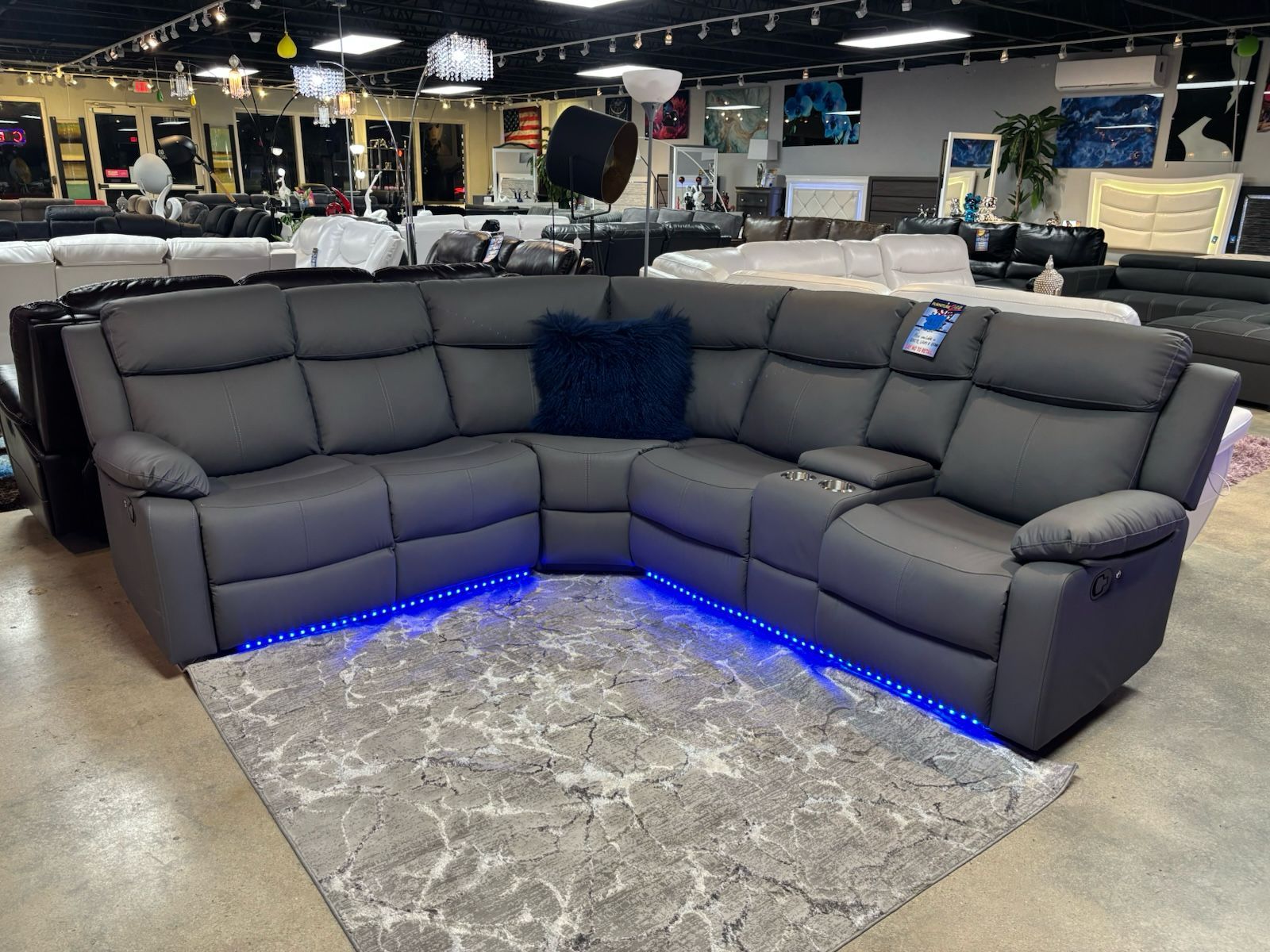 Grey reclining sectional with Led lights in alfombra gratis for only $1099. Also available in white, black, and brown.