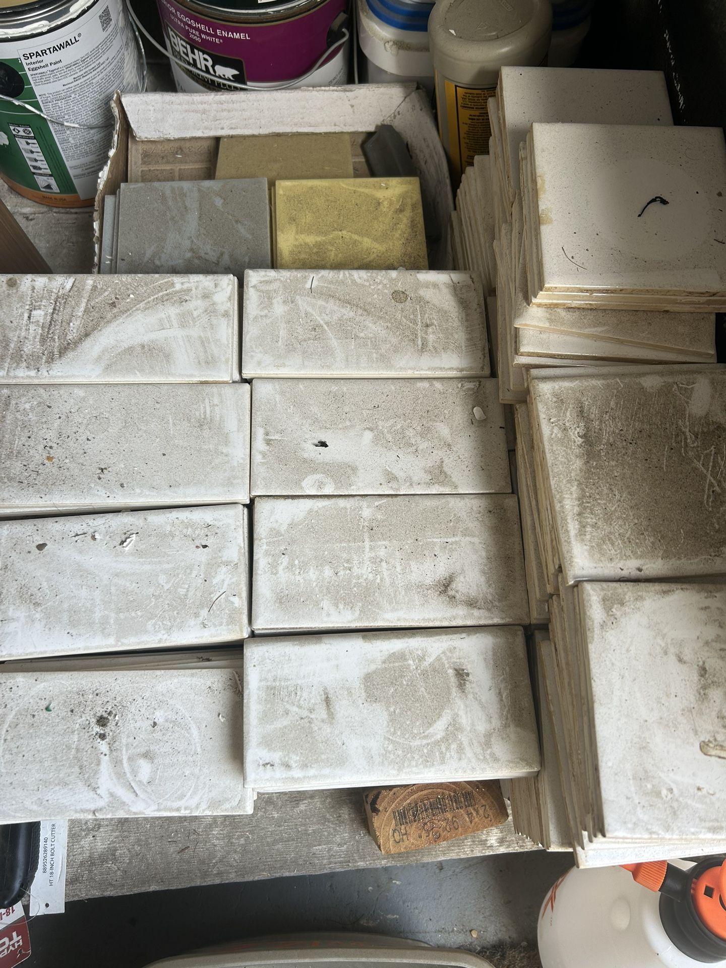 White subway and square tiles unused. Subway has 117 count and the square has 106 count. Random grey (8 count) and yellow (9 count) tiles included