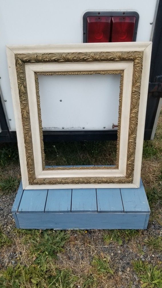 Large wooden picture frame. Beautiful detail. Paint has chips and needs to be redone. Looks antique and signs of age and wear/distress. Picture opening is 16"×20"