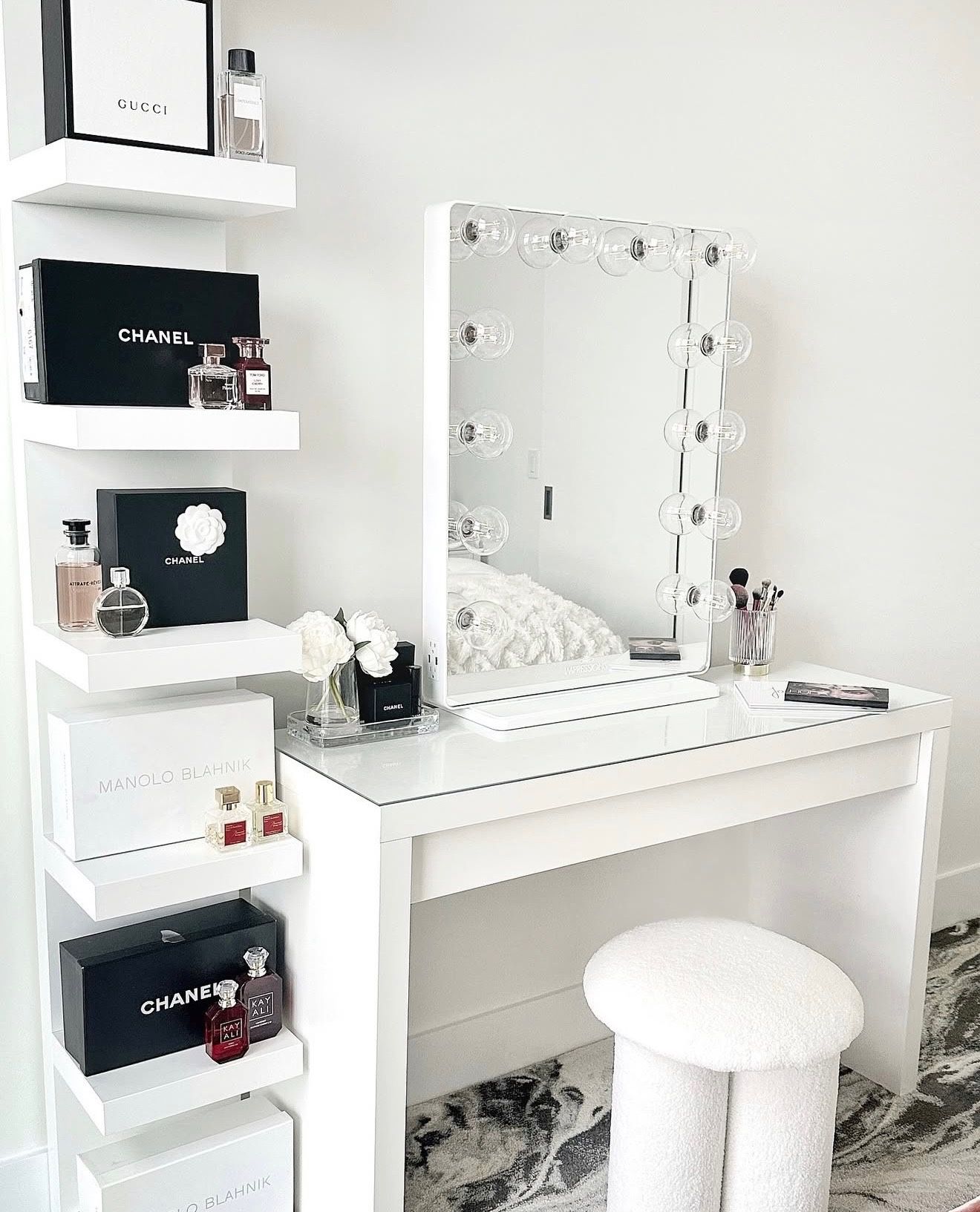 almost new. Dimmable lighting around mirror. Organizing compartments in drawer. Mirror is 31in tall and 23in wide Vanity is 30in tall 47 in wide Depth 16in Shelving is 74in tall 11.5 width 11in depth Mirror is missing 1 bulb that can be replaced. Everything new was $600 total