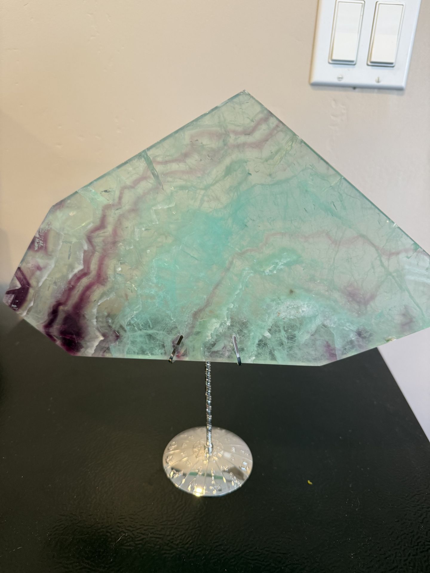 Beautiful large rainbow fluorite slab featuring vibrant mint green, teal, and deep purple banding. The natural layering and translucency really stand out in the light, making it a gorgeous statement piece for a shelf, desk, or entryway. Details: • Genuine rainbow fluorite • Polished slab with raw natural edges • Includes metal display stand • Colors: green, aqua, purple banding Perfect for: • Crystal collectors • Home or office decor • Energy/healing spaces • Unique gift idea Offers considered.