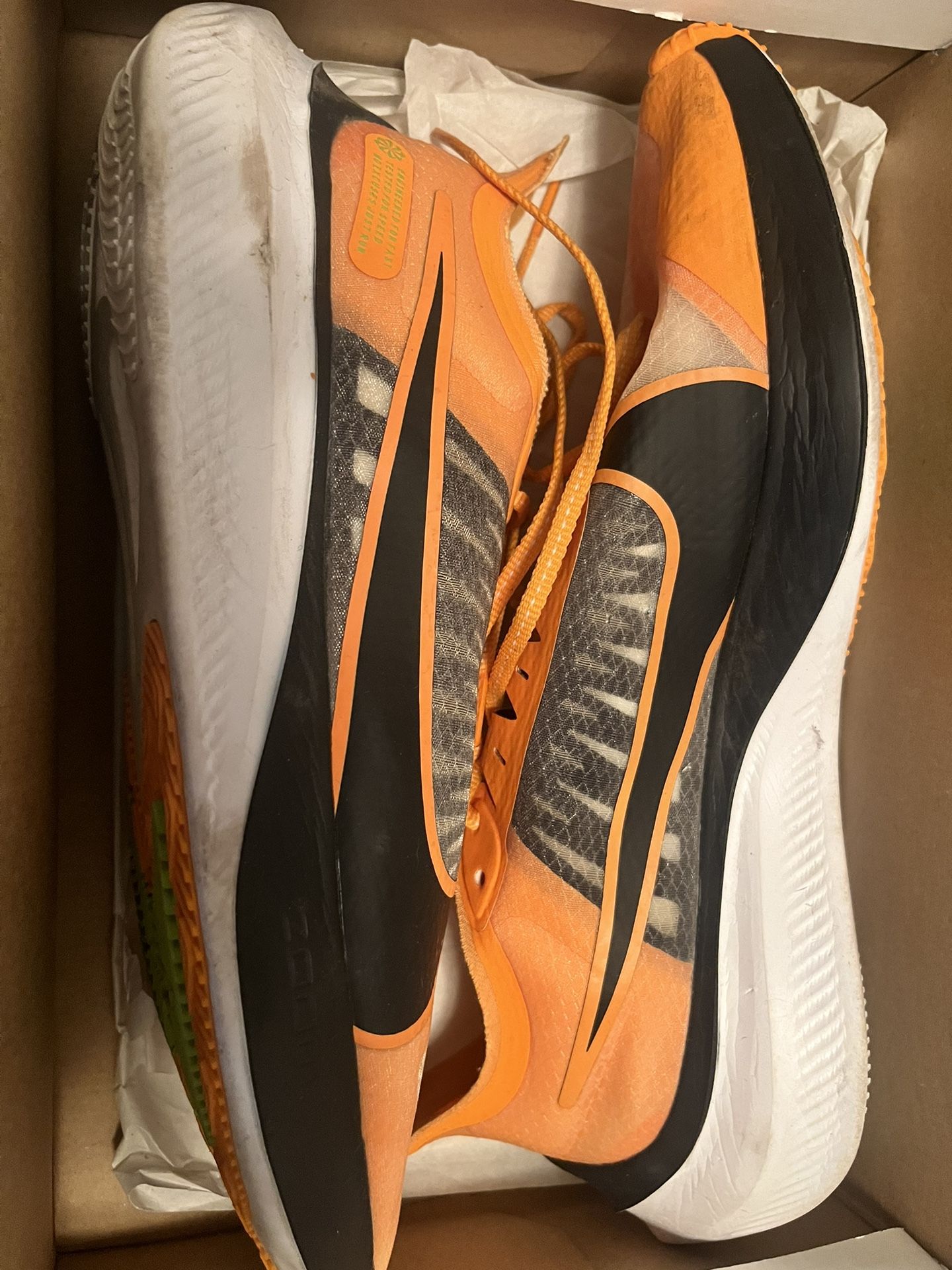 Bright orange, black and white Worn once to workout , just didn’t like the fit/feel on my foot. 9 1/2 men’s shoe