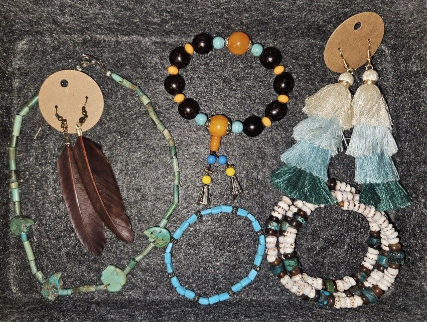 Turquoise LOT Of 6 Pieces 1 stone necklace 2 Pairs of Earrings-1 Feathers 1 Dangle multi colored 3 Bracelets *This ITEM is USED *JEWELRY SALES ARE FINAL