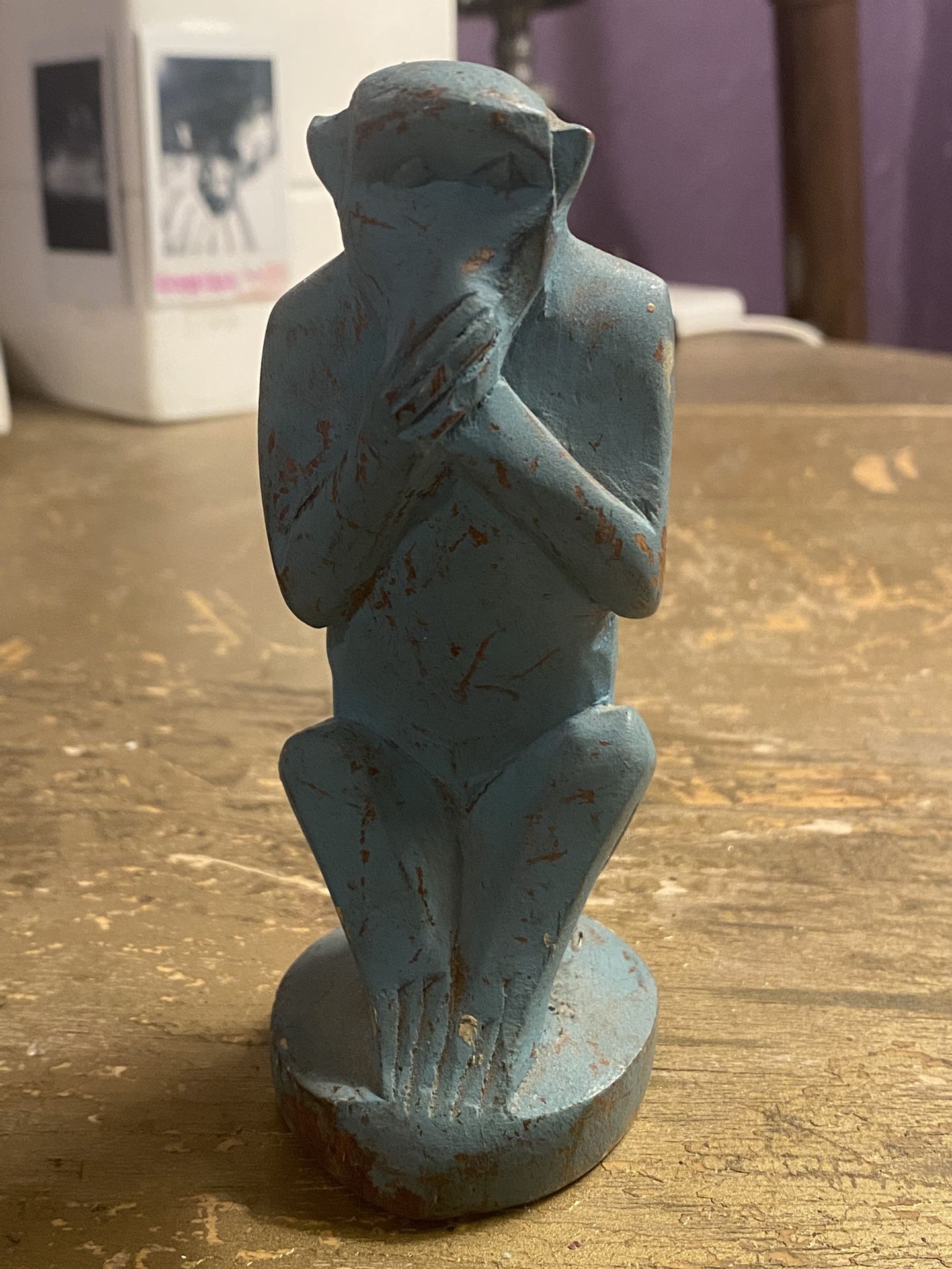 very old monkey "speak no evil"; wooden carved small figurine; light blue