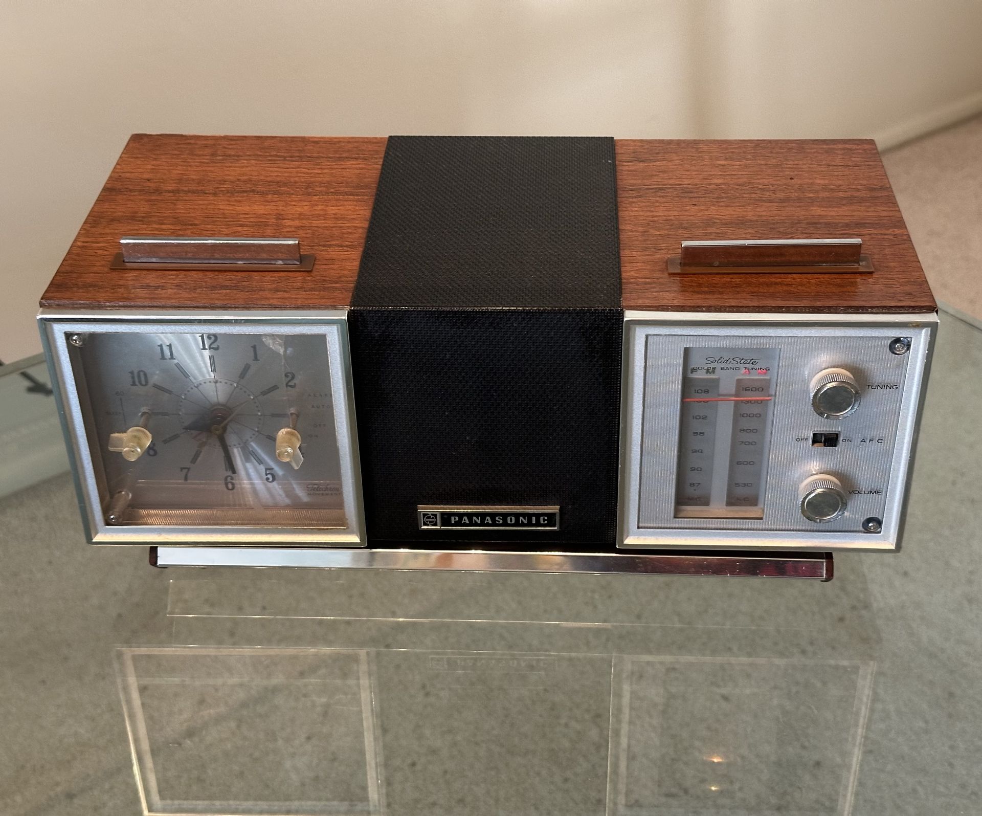Super Cool Vintage Panasonic RC-7467 Transistor Clock Radio Rotating Teak Wood