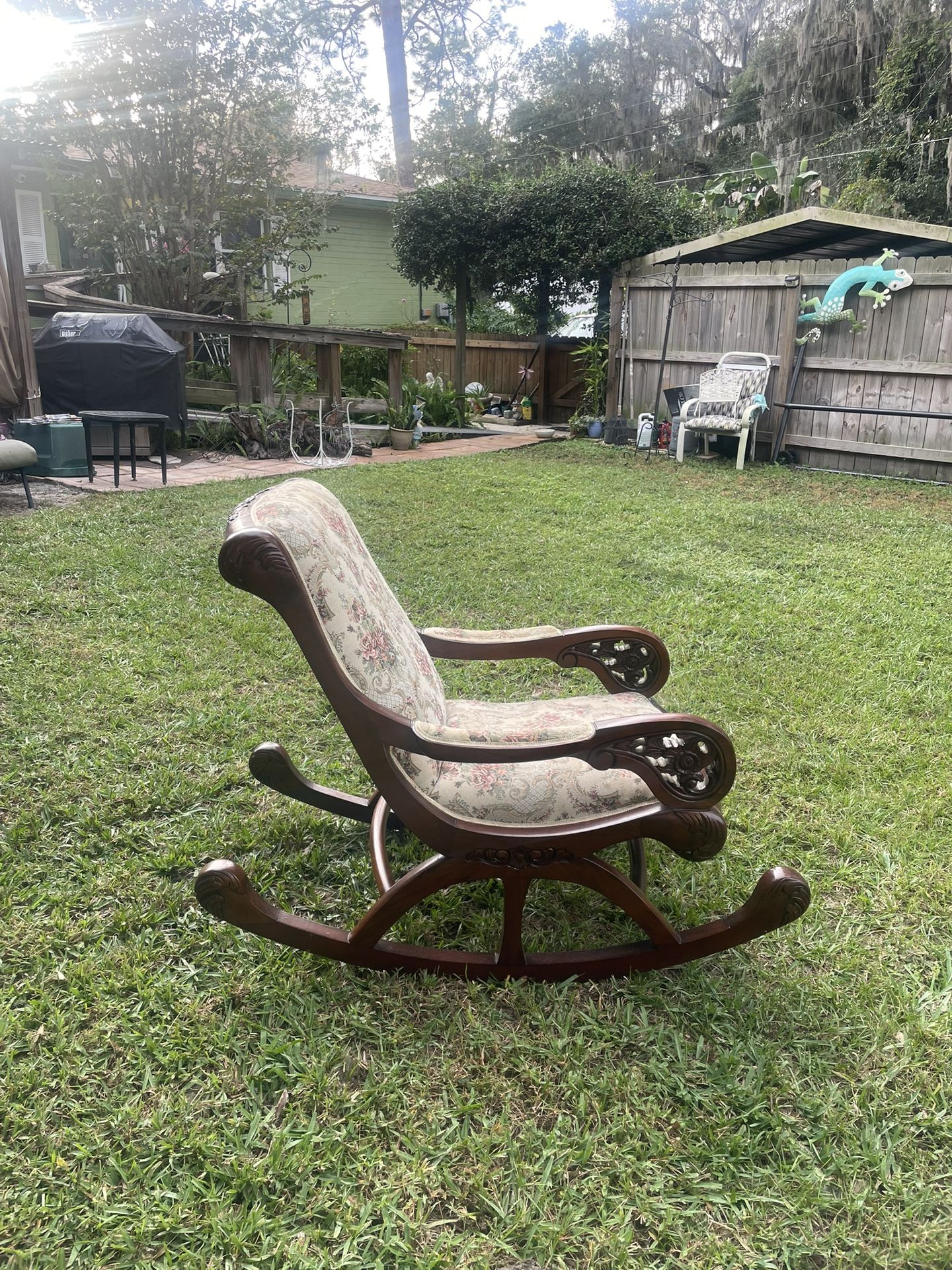 Beautiful matching pair of antique-style chairs featuring solid dark wood frames with detailed hand-carved designs and floral upholstered cushions. One is a traditional armchair and the other a rocking chair. Both are sturdy, elegant, and perfect for a vintage or classic home look. Condition: Good overall – minor wear from age, no major damage.