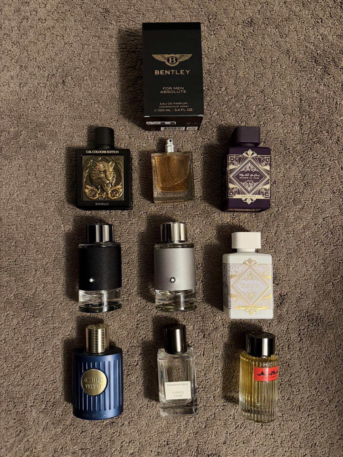 All between 90-100% full. $10-$15 each. Bentley Absolute Lattafa Honor and Glory Lattafa Amethyst Rochas Moustache Banana Republic Cypress Cedar Montblanc Explorer Montblanc Explorer Platinum Khadlaj Azure Velvet D&G The One Rayhaan Tiger