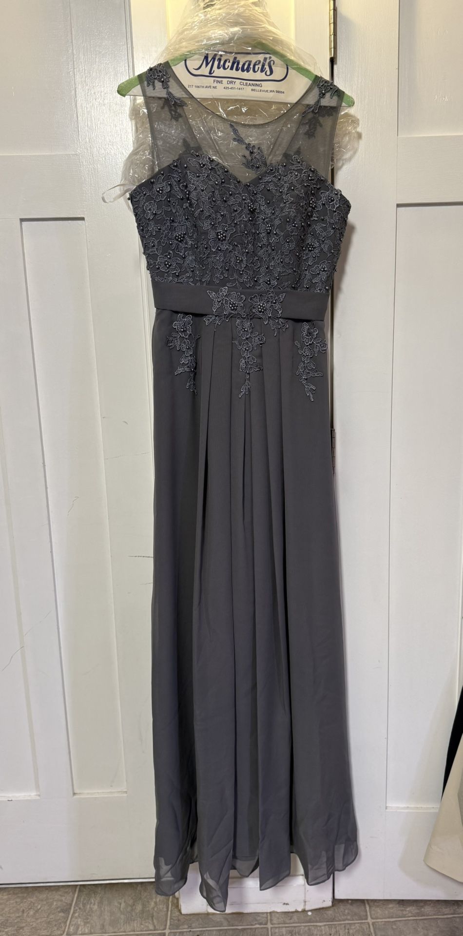 Women’s Full Length Sheer Neck Evening, Bridesmaid, or Prom Gown Size: US2 Color: Grey Worn once for a wedding. It’s been freshly dry cleaned. I’m 5’3” and like 112lbs and it fit great, looked lovely and was comfortable to wear all night. $60 OBO