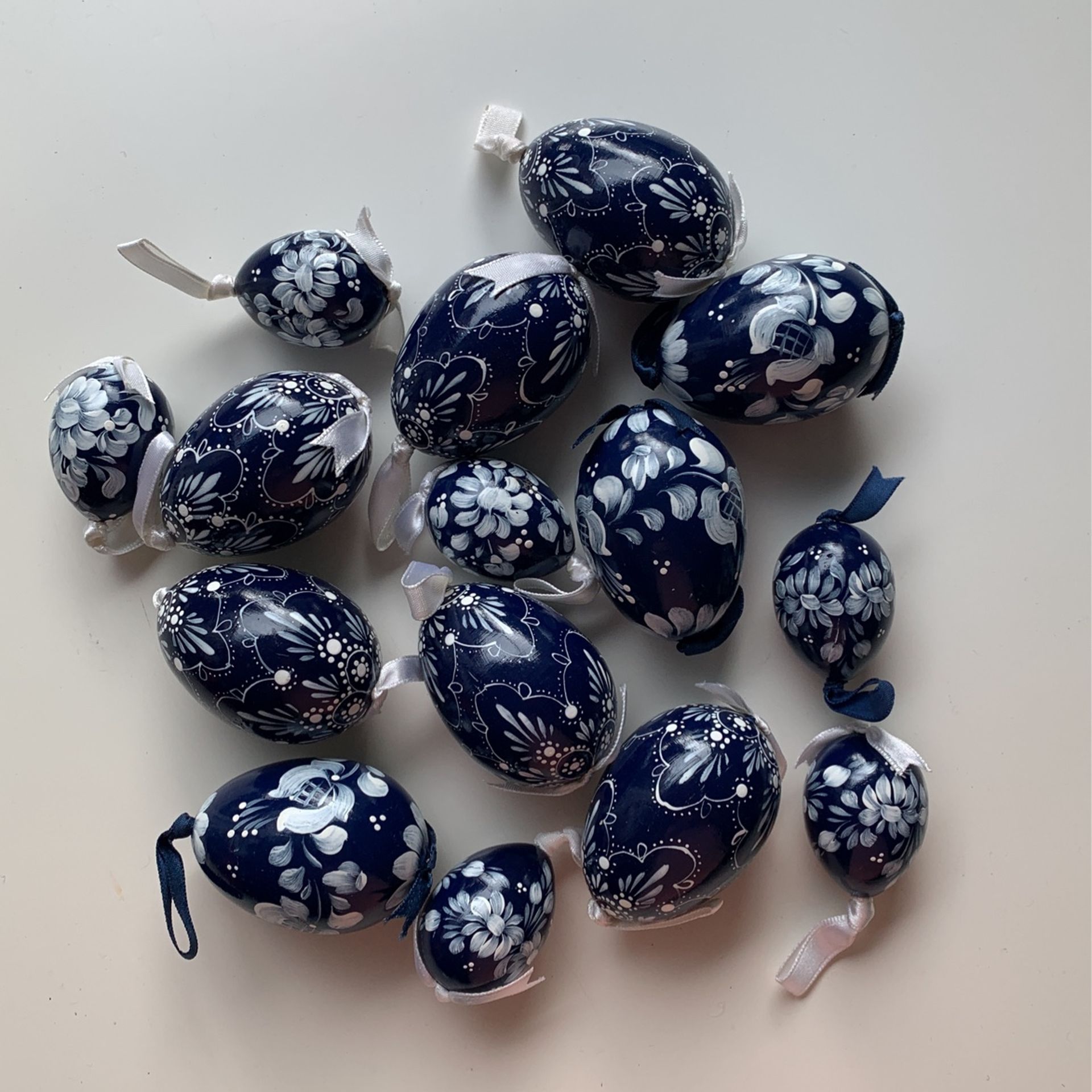 3” and 2” wooden eggs, hand painted in white paint. European.