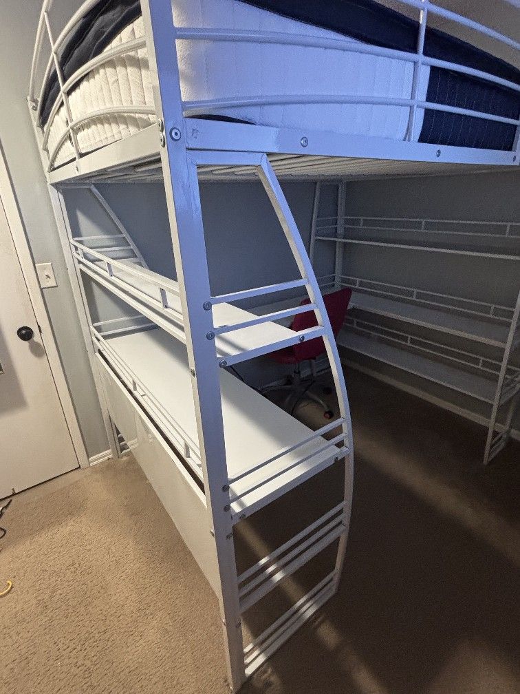 Space saving Full size loft bed for sale. The pink chair is included with purchase but the mattress is not. Plenty of desk space for studying and shelf space for storage. This bed is perfect for small spaces without sacrificing storage. The bed was disassembled in 4 pieces for easy assembly. All hardware included. Owned for 2 years and only selling because our ceiling space is too low for the height. Bed in great condition. Must be able to haul away. Serious inquiries only. Name your price! Cash or Zelle accepted.