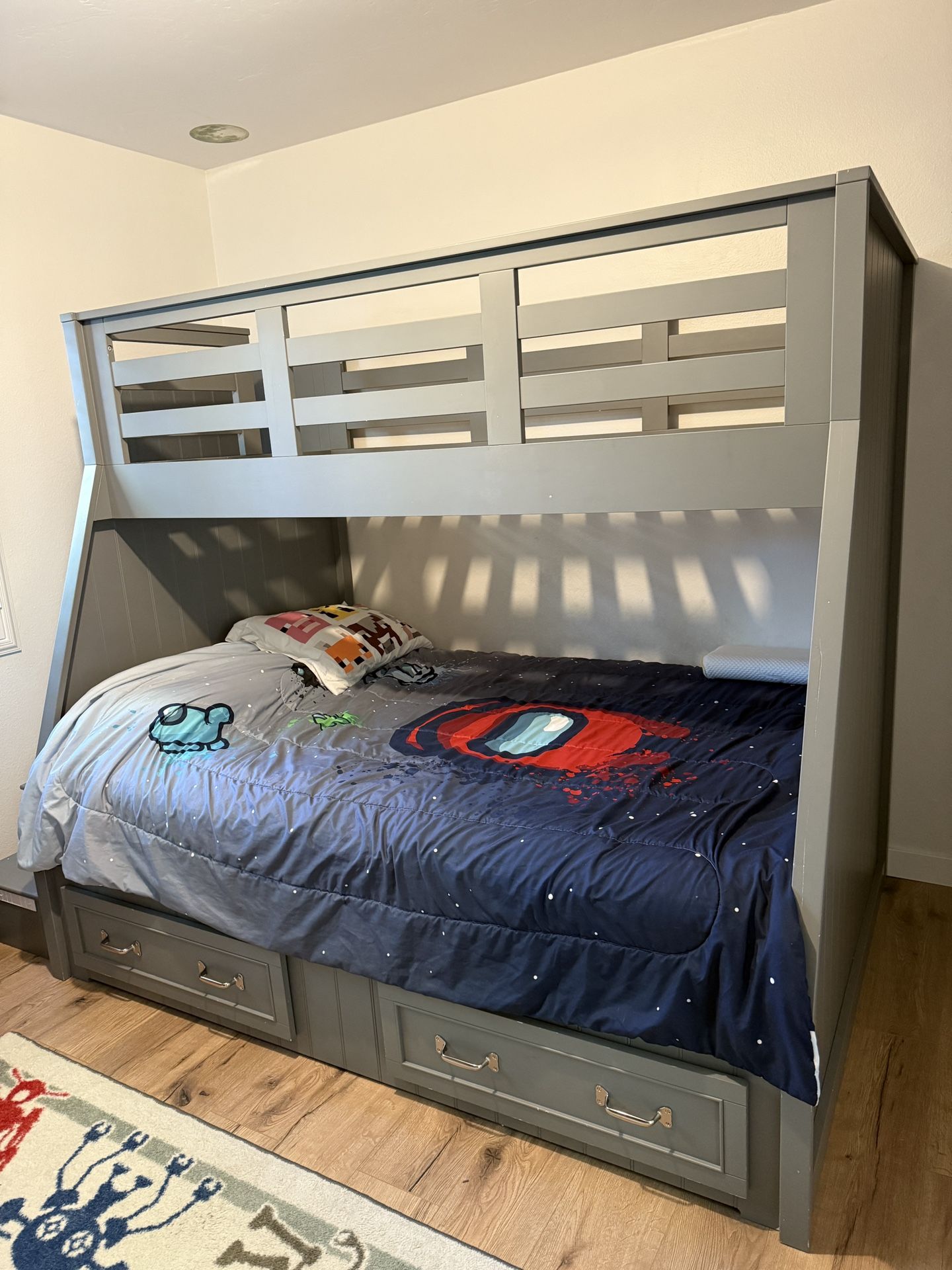 **can deliver within San Diego County** Twin over full bunk bed. A grayish blue hue. Motion sensor lights on stairs Overall: 57" wide x 99" long x 70.5" high Stair Size: 43.5" wide x 15.75" deep x 70" high Distance between steps (6): 8" high Open Space between Bunk Beds: 56" wide x 75" long x 34" high Clearance under guard rail: 48.5" high Top Twin Bunk: 39" wide x 75" long Top Guardrail: 75" long x 21.75" high x 2" thick Twin Bed Mattress Platform: 38.5" wide x 75" long Bottom Full Bunk: 57.5" wide x 99" long x 70" high Full Bed Mattress Platform: 54" wide x 75" long Drawer (2): 30" wide x 19" deep x 9" high Weight: 436 lbs