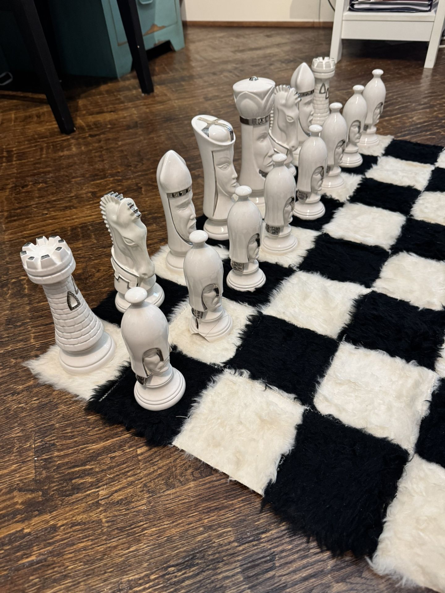 Set is in great condition overall and the glaze on the pieces is beautiful. 2 white pieces have damage (queen and pawn). Please look at the pictures for details. Doesn’t affect play, but the pawn is noticeable. If you don’t want to play with these the pieces (especially the rooks and knights) would make incredible decoration pieces! Pawn is nearly 5.5” and King almost 8” tall. Comes with board that appears to be hand stitched fabric.