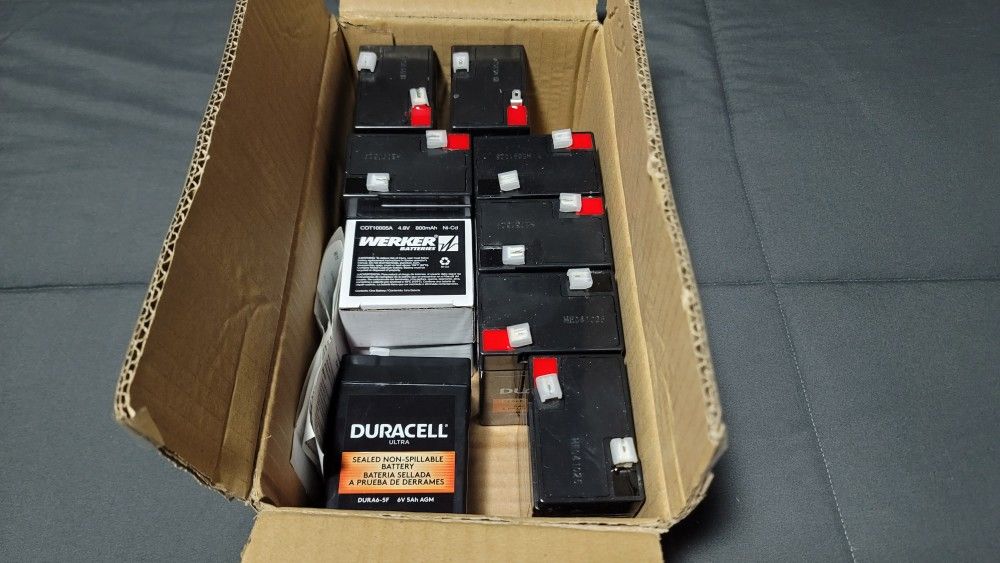 This listing is for the Duracell DURA6-5F, a premium 6-Volt 5Ah Sealed Lead Acid (SLA) battery. Engineered with advanced Absorbent Glass Mat (AGM) technology, these batteries are designed for high-reliability applications where consistent power and long service life are critical. We have 8 of these available. Our return period ended, so as usual, our loss is your gain. Key Features & Benefits Maintenance-Free Design: Fully sealed and spill-proof; no need to add acid or water. AGM Technology: Provides superior vibration resistance and efficient gas recombination for a longer lifespan.Versatile Mounting: Leak-proof construction allows for operation in multiple orientations (except inverted). High Reliability: Low self-discharge rate makes these ideal for standby and occasional-use equipment. Direct Fit: Features standard F1 (.187") terminals for quick, secure connections. Technical Specifications Mode lDuracell DURA6-5F Voltage6VCapacity5Ah ChemistrySealed Lead Acid (AGM) Terminal TypeF1 (.187" Faston) Weight~1.8 lbs (per unit) Dimensions (L x W x H)2.76" x 1.85" x 3.98" (70 x 47 x 101 mm) Total Height (w/ Terminals)4.13" (105 Common ApplicationsThe DURA6-5F is a standard size used in a wide variety of commercial and residential devices, including: Emergency Lighting: Exit signs and backup lighting systems. Security & Fire: Alarm panels and motion sensors. UPS Systems: Battery backups for computers and electronics. Toys & Hobbies: Power Wheels® and other 6V ride-on toys. Medical Equipment: Portable monitoring and backup devices. Note: Please verify the dimensions and terminal type of your existing battery before ordering. Most 6V 4.5Ah and 5Ah batteries share this footprint, but terminal width (F1 vs. F2) can vary. Thanks for taking a peek and we hope you have a Poyfect day!