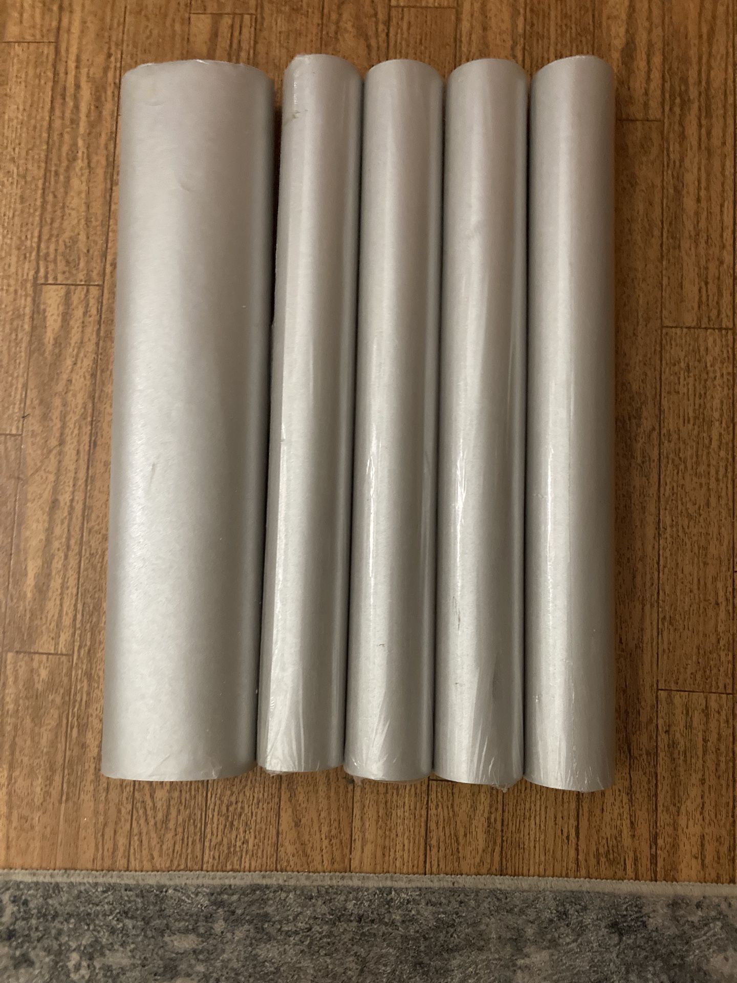 Wallpaper Color Silver! Five rolls of silver wallpaper. Four sealed and one unopened and leftover from the roll the total is more than 4 1/2 Rolls. It measures 21 1/8” wide 50 sq Ft per Roll !! It also comes with bucket of paste !