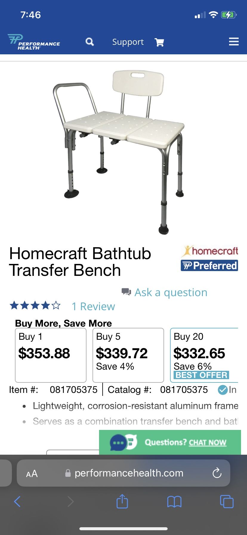 Homecraft Bath Tub Transfer Bench With Backrest- New