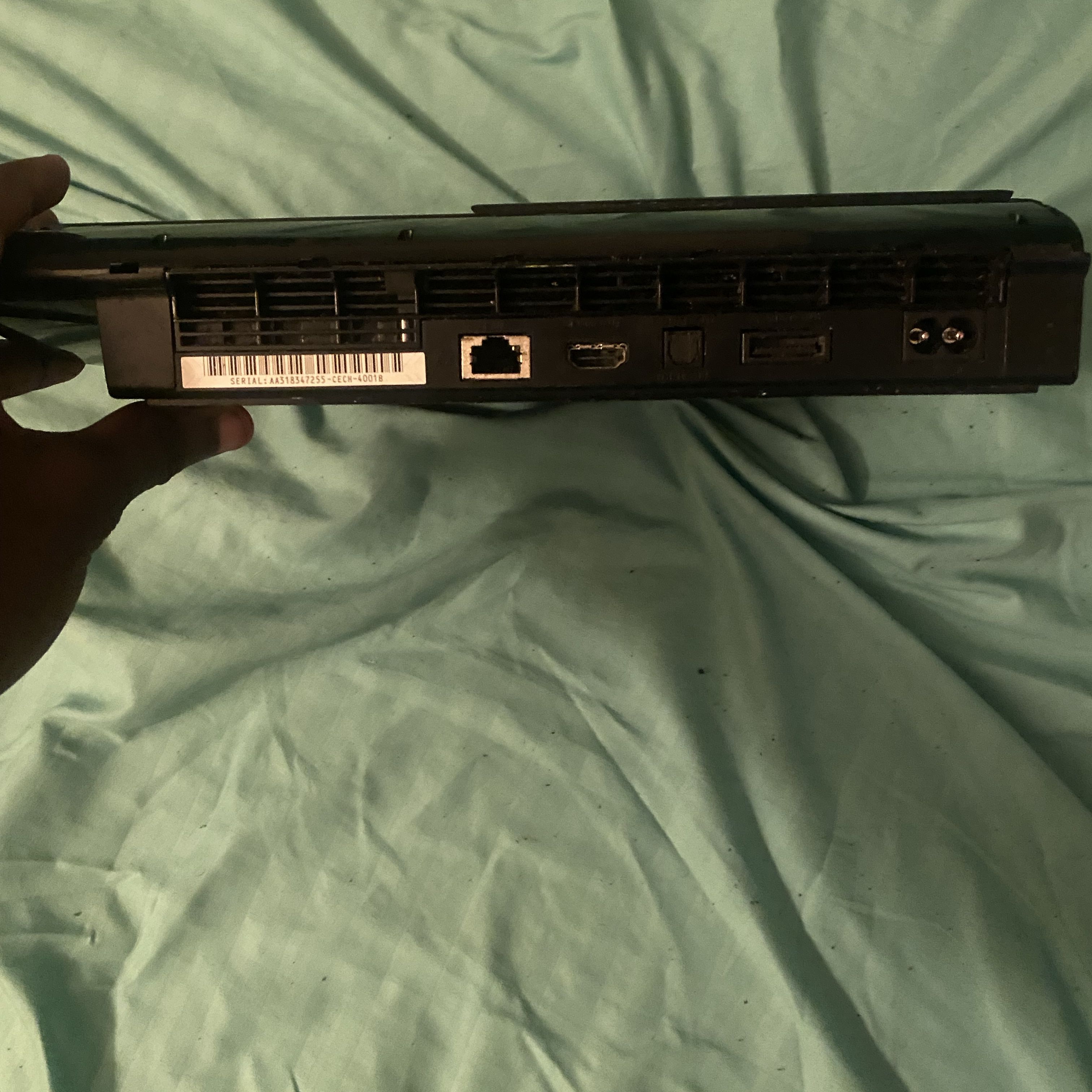 PS3 Slim model gaming console with HDMI port and ethernet connection. Black color with standard ports on back panel.