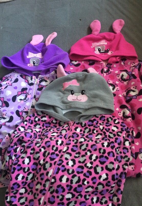 $2.00 each, Used 2t girl pjs.Great for winter, all have hoods.Bought off zulily web site last winter so brand is not recognizable but very cute. No tears or rips, just bottom of footie is a little dark due to walking.