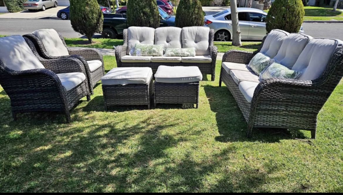 Outdoor patio furniture in used- good condition with brand new black cushions still in box . Moving out need gone asap !