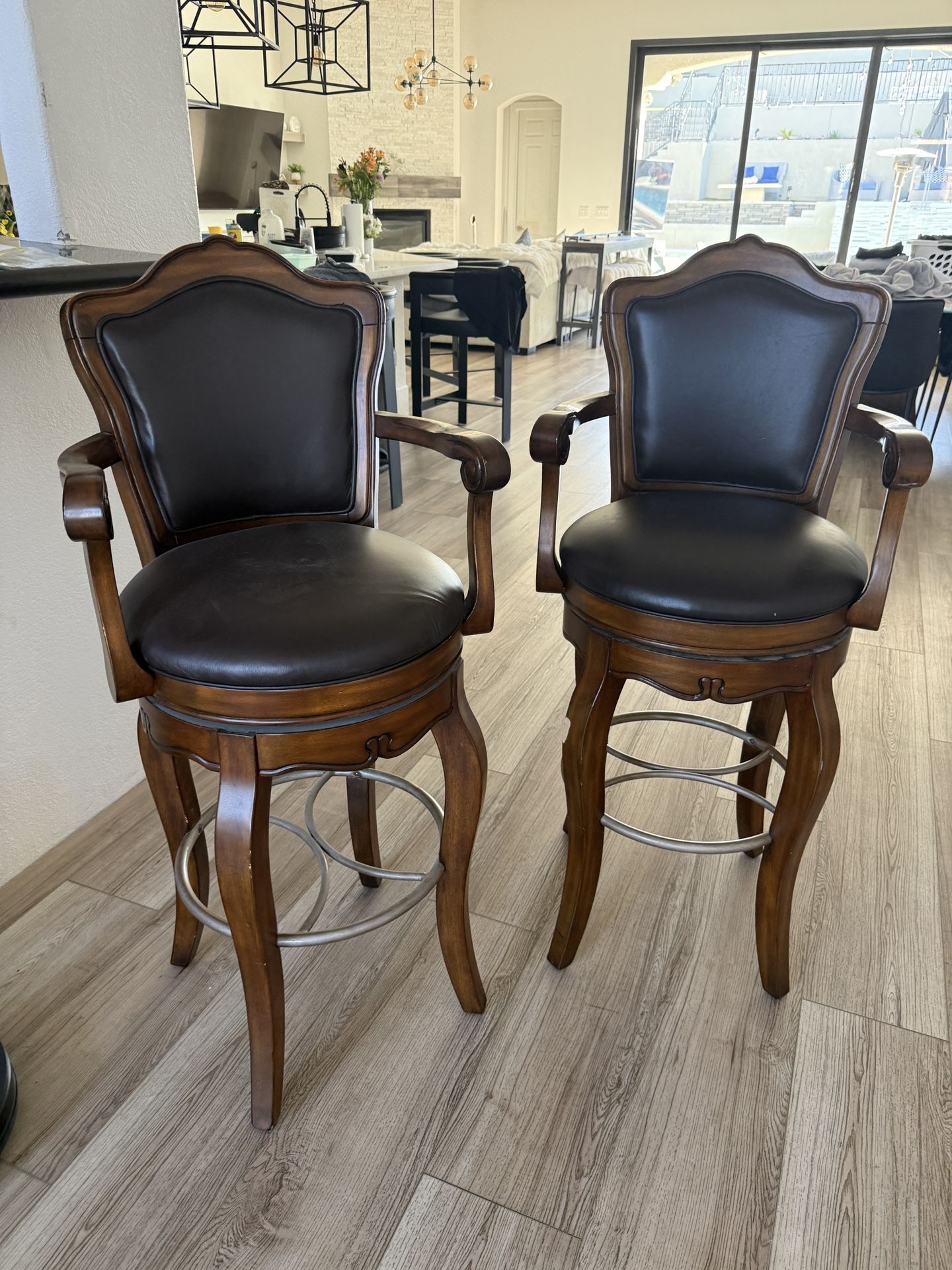 Beautiful pair of classic solid wood swivel bar stools. • 30” seat height (bar height) • Smooth swivel function • Padded faux leather seats and backs • Comfortable armrests • Sturdy and well built Both stools are in very good condition with minor cosmetic wear consistent with normal use (see photo). Perfect for kitchen island or home bar. Sold as a pair only. Pickup in Henderson. Make Offer.