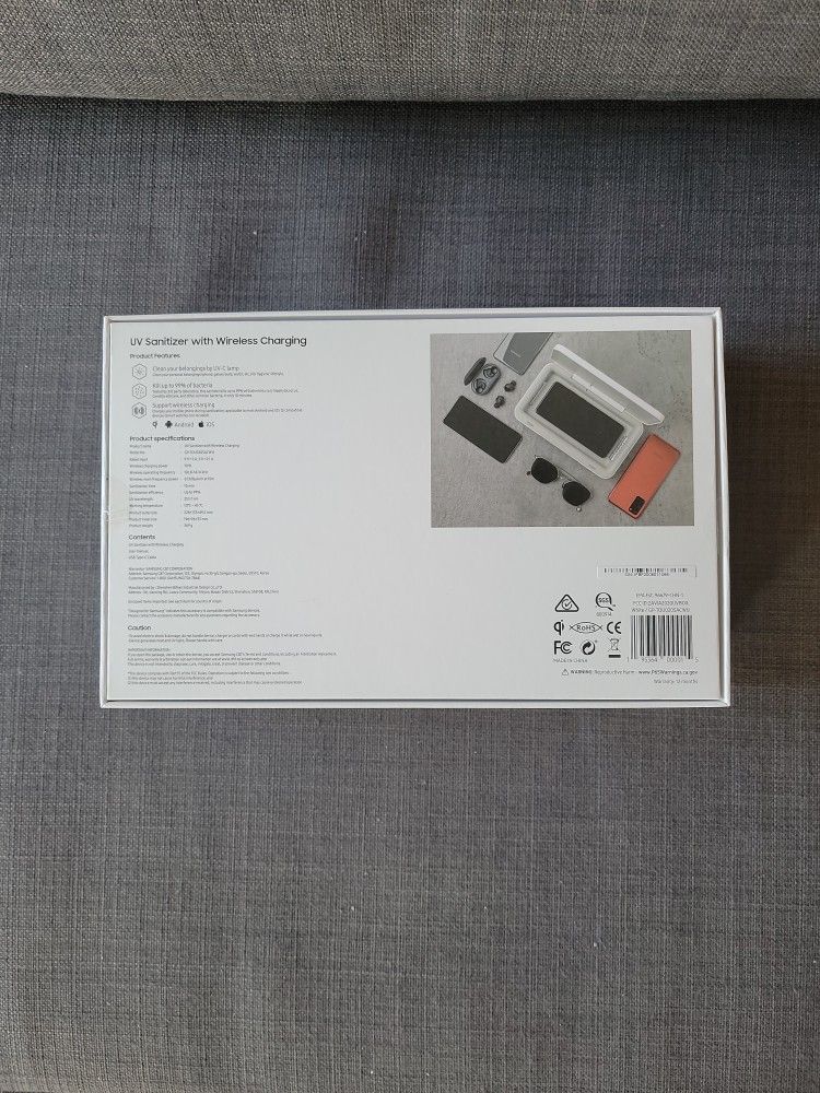 Brand New Item. Kills up to 99% of bacteria within 10 mintues. UV Sanitize and Wireless Charge your device at the same time UV Sanitizer with Wireless Charging Product Features Clean your belongings by UV-C lamp Clean your personal belongings (phone, galaxy buds, watch, etc.) for hygienic lifestyle. Kill up to 99% of bacteria Support wireless charging Charges your mobile phone during sanitization; applicable to most Android and iOs QI compatible devices (Smartwatches not incuded) Android iOS Product specifications Product name : UV Sanitizer with Wireless Charging Model No. : GP-TOUOZOSACWU Rated input : 9V-2 A, 5 V-2.1 A Wireless charging power : 10 W Wireless operating frequency : 126.8-147.4 kHz Wireless main frequency power : 0.13dBuA/m at 10m Sanitization time : 10 min Sanitization efficiency : Up to 99% UV wavelength : 253.7 nm Working temperature : 10°C - 45 °C Product outer size : 228x133x49.5 mm Product inner size : 196x96x33 mm Product weight : 3699 Contents UV Sanitizer with Wireless Charging User manual USB Type-C Cable Warrantor: SAMSUNG C&T More details: https://offerup.co/faYXKzQFnY?$deeplink_path=/redirect/