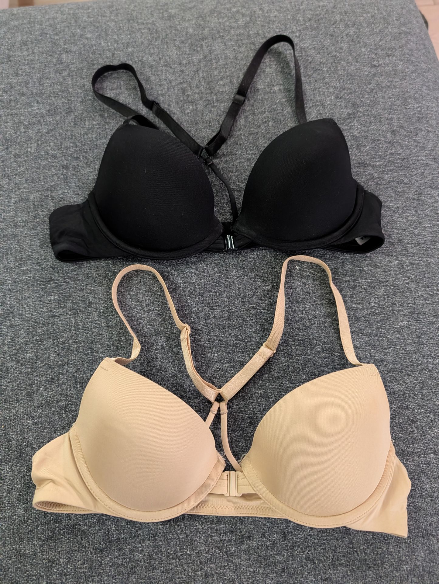 EUC Express Intimates Racerback Padded Underwire Bras (2) - 34A, Black/Nude $20 for both Excellent used condition. From a smoke and pet free home. Local buyers pick up from SE Renton. Racerback Demi cup Front closure Adjustable straps