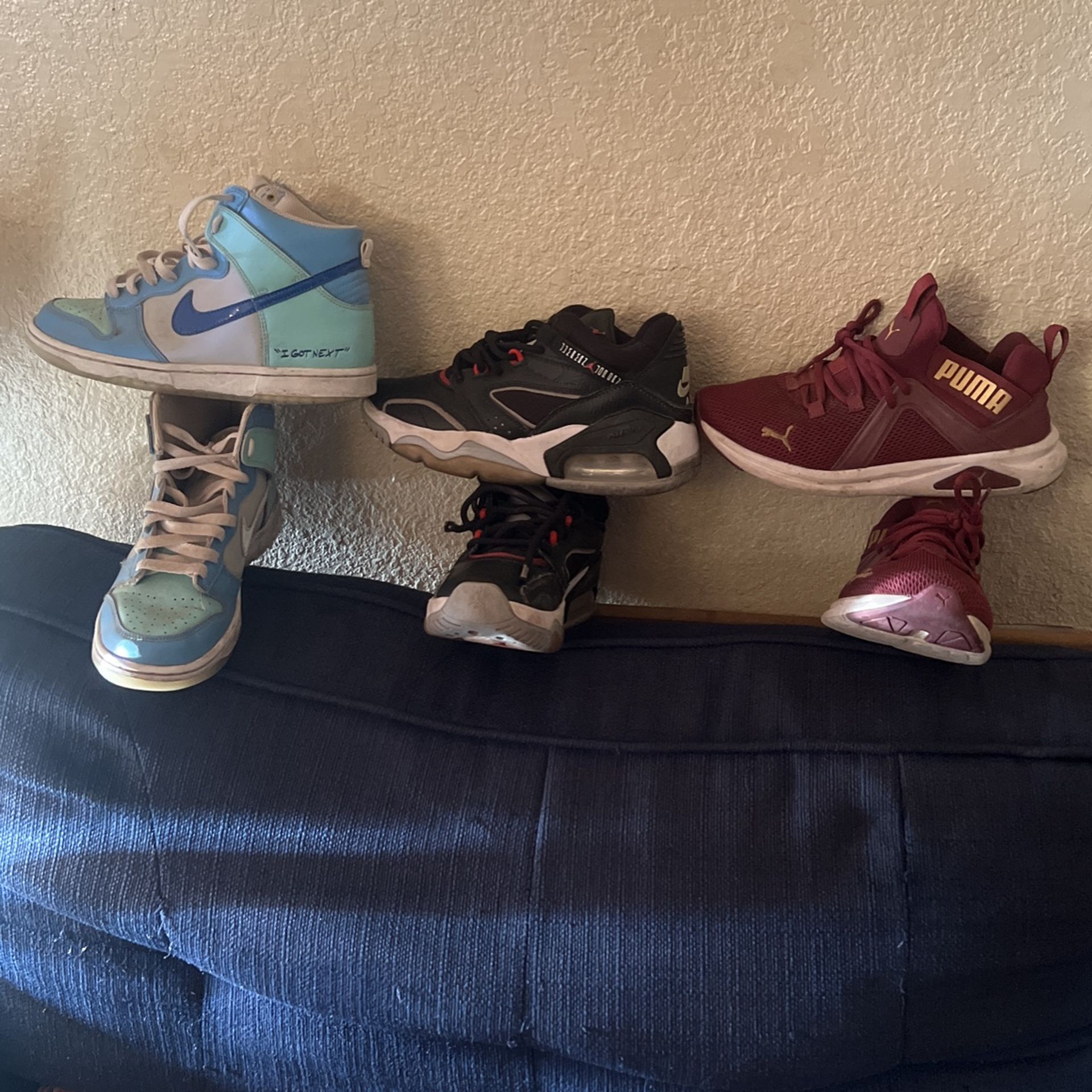 The blue and black one are size 5 the pinkish runner shoes are size 7 women the other two shoes are men/kids