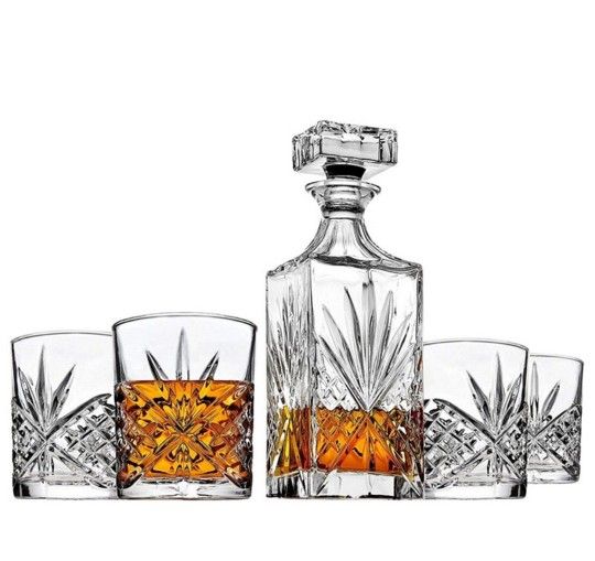 Brand New Dublin collection Crystal 5 Piece Decanter Whiskey Set Savor your favorite drink in this beautiful set. Never opened sealed pack. Includes 25oz Whiskey Decanter and 4 Double Old Fashioned 11oz Glasses.
