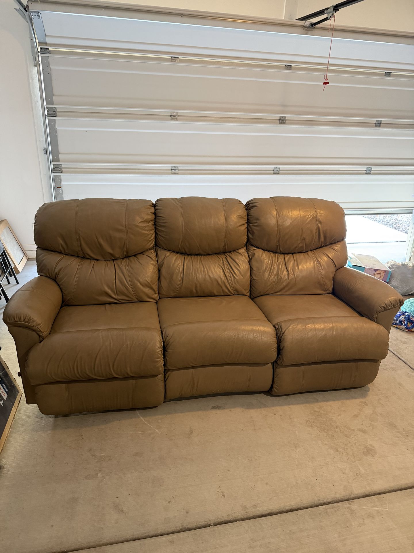 Leather still in good condition no cracks or tears. Extremely comfortable sofa selling because I got a new one! Backs come off for easy pick up. Pick up preffered but willing to deliver for an additional fee depending on location of delivery. It’s a manual recliner. Hearing reasonable offers. Let me know for any additional questions.