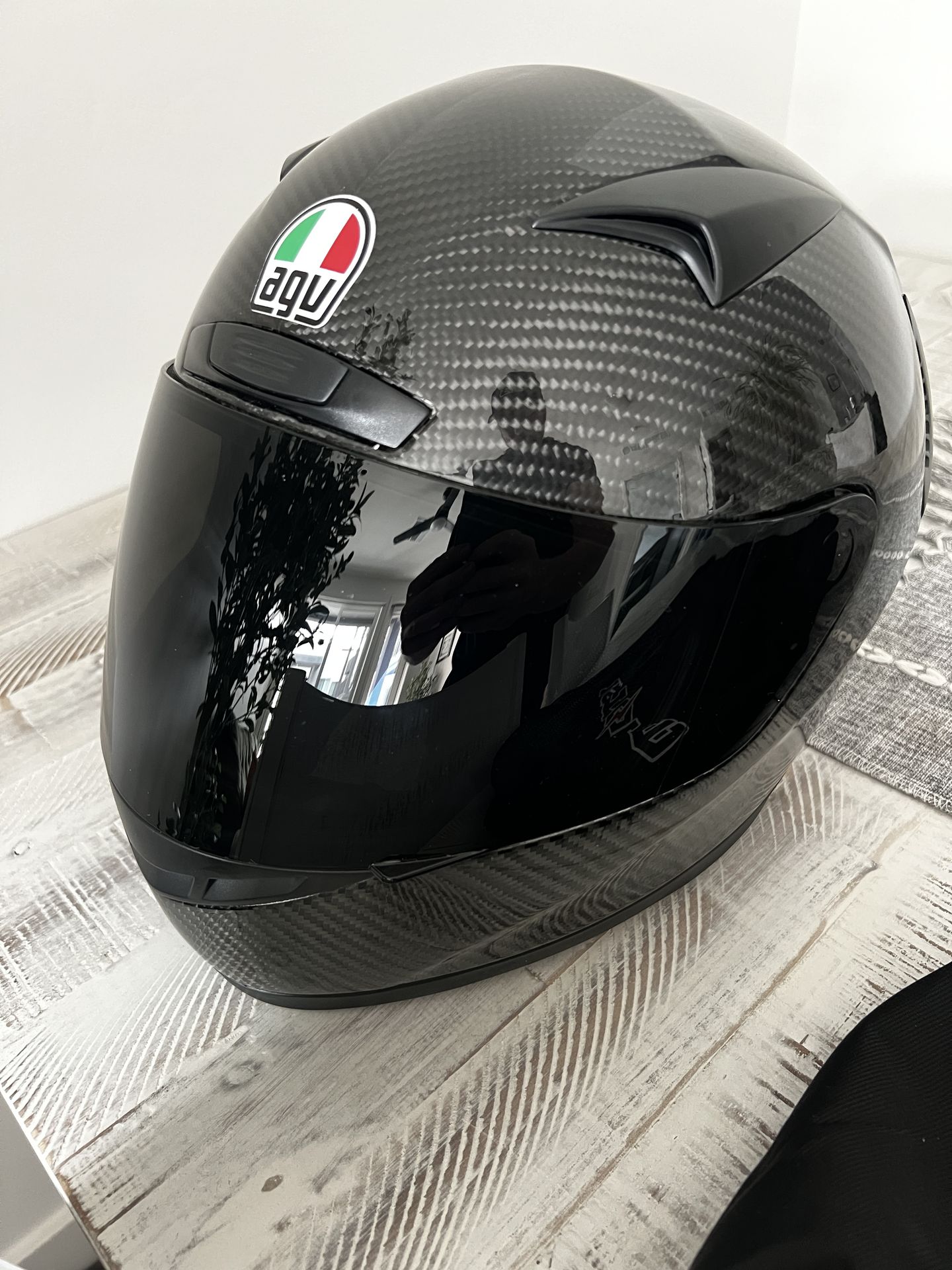 I bought this helmet new about 6 months ago to have as a backup/passenger helmet but haven’t ever used it. Still brand new in the cushioned helmet bag it came in. This was $210 new when I got it, selling for $100 firm. The carbon fiber weave is beautiful and very high quality with a tinted, smoked visor installed.