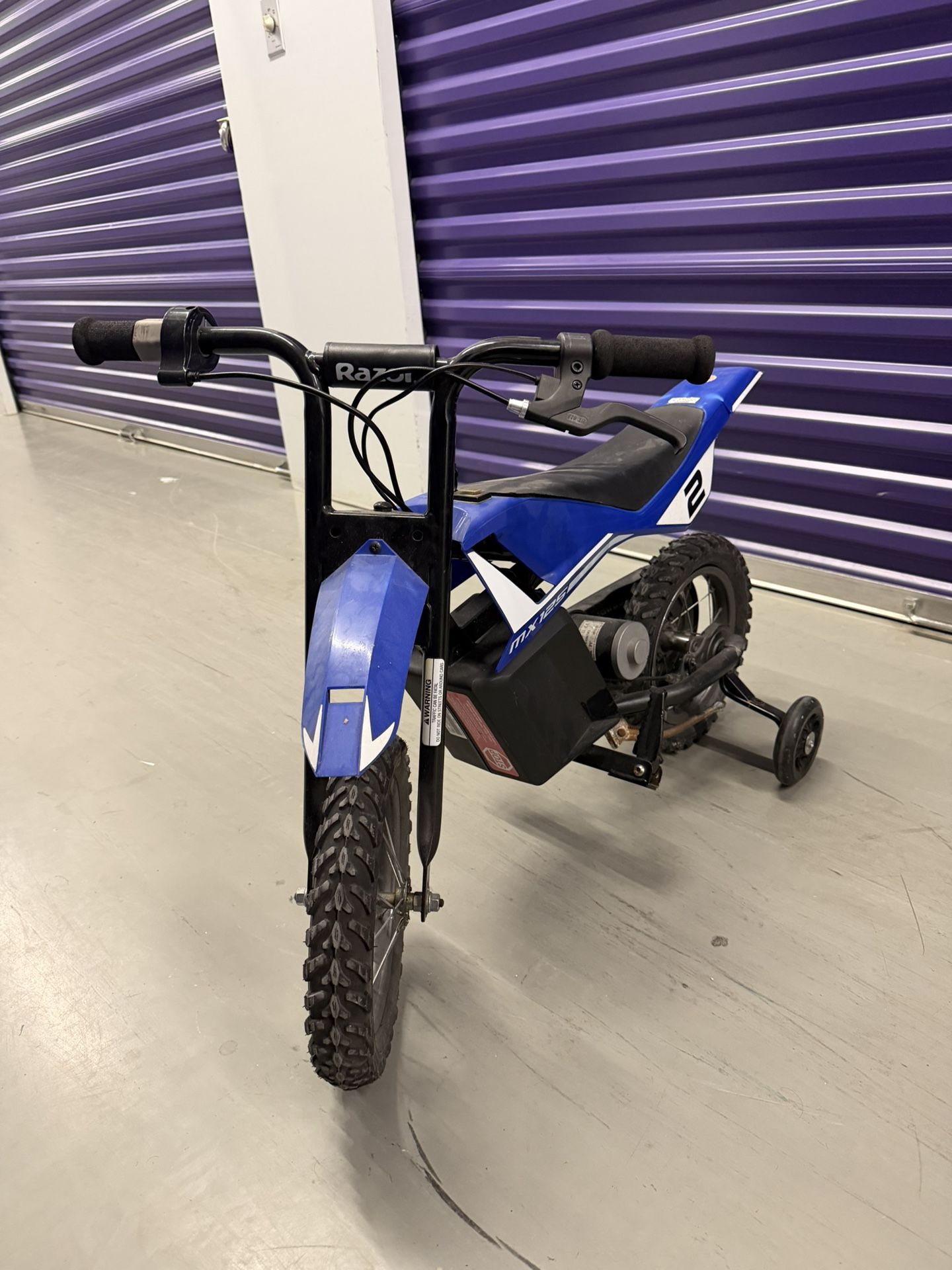 Razor MX125 Dirt Rocket - Bicicleta eléctrica con auténtica geometría de motocross, tracción trasera, 100 vatios, alto par, motor impulsado por cadena, para niños de 7 años, color azul
