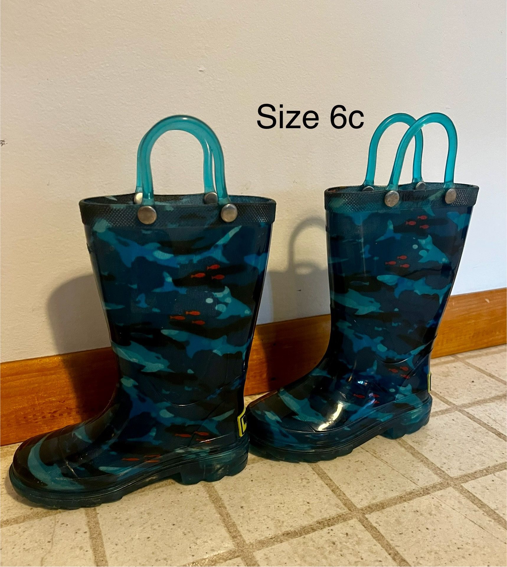 Western chief light up rain boots with blue shark pattern. Lightly used and good for many more puddles!