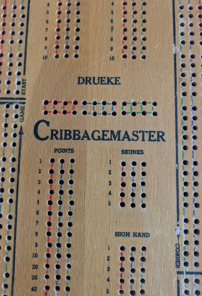 Cribbagemaster Drueke Game 8 Blue Pegs 5 Red Pegs 6 1/4 Width 14.5 Length Preloved and Played No box or directions Local Brandon pickup or delivery Smoke free home Open to Reasonable offers Thank you Sandra