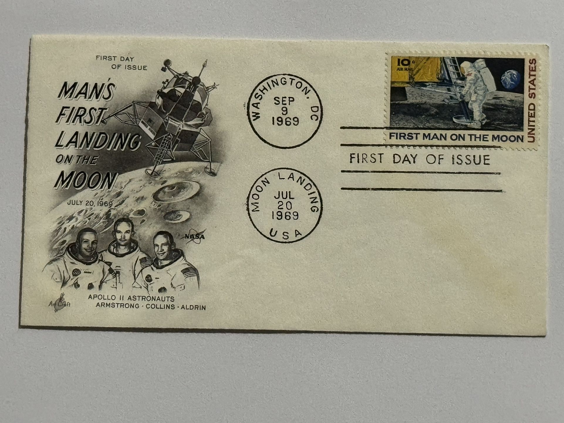 First Day of Issue Envelope and Stamp First Day of Issue Envelope Washington D.C. 1969 Man’s First Landing on the Moon July 20, 1969 Apollo 11 Astronauts Armstrong, Collins, Aldrin NASA First Man on the Moon 10 Cents U.S. Postage Uncirculated Uncertified Ungraded $20 Check out our other many exciting items! Lots more being added all the time!