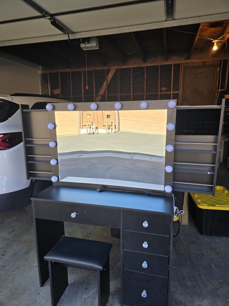 2-year-old vanity set. Plugs into wall and switch on the side turns on and off with different light shades. Right side has a ring holder. Left side does as well it's just brand new and hasn't been installed so I can give it to you to put in. There is a scratch that I could not buff out on the table portion as seen in the photos. Not too noticeable and if you're creative I'm sure you can figure out a way to hide it