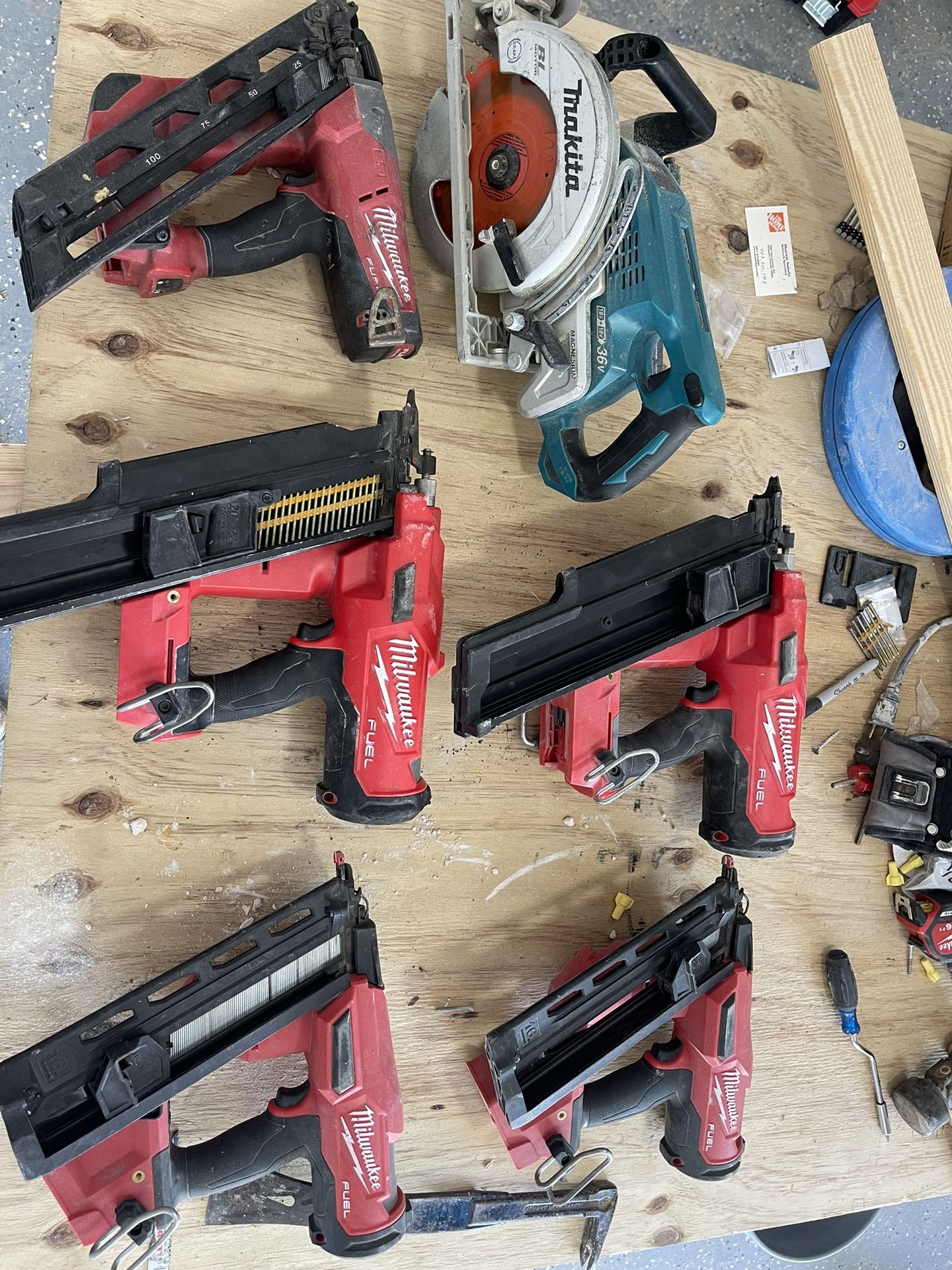 M18 Milwaukee 21 degree framing nailer 220$ each M18 Milwaukee angled 16 gauge nailer 200$ each Makita 36 volt rear handle circular saw 80$ M18 milwaukee 15 gauge nailer 150$