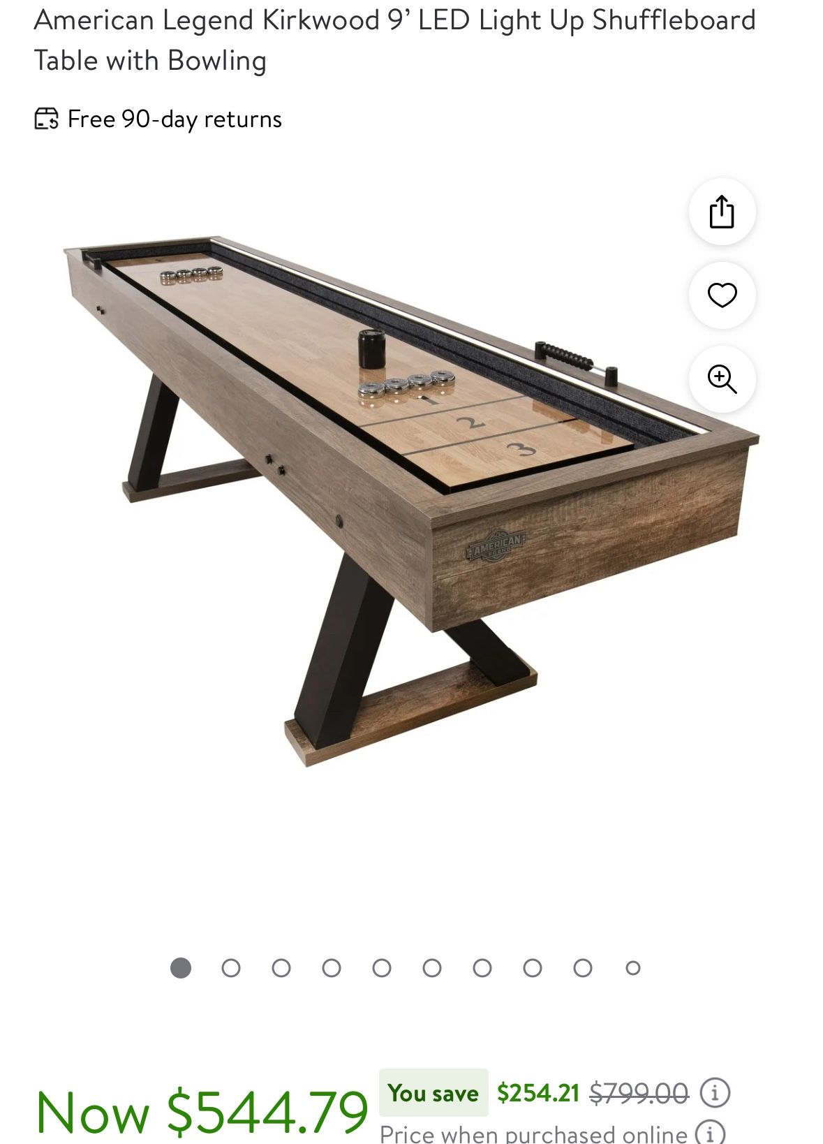 A two for one, the American Legend Kirkwood 9’ LED Light Up Shuffleboard Table with Bowling combines two beloved games in one while providing a unique twist to both. The Kirkwood’s rustic wood grain finish, gray carpeted gutters and k-shaped legs accent its classic look while the LED light up rails provide a fun, arcade feel. This multi-faceted table comes ready to play for both games. It includes AC adapter to power the LED lighting, 10 bowling pins, pin setter, and surround to prevent pins from falling off of the table for bowling and eight chrome metal weighted pucks for classic shuffleboard. Brand new in box✅