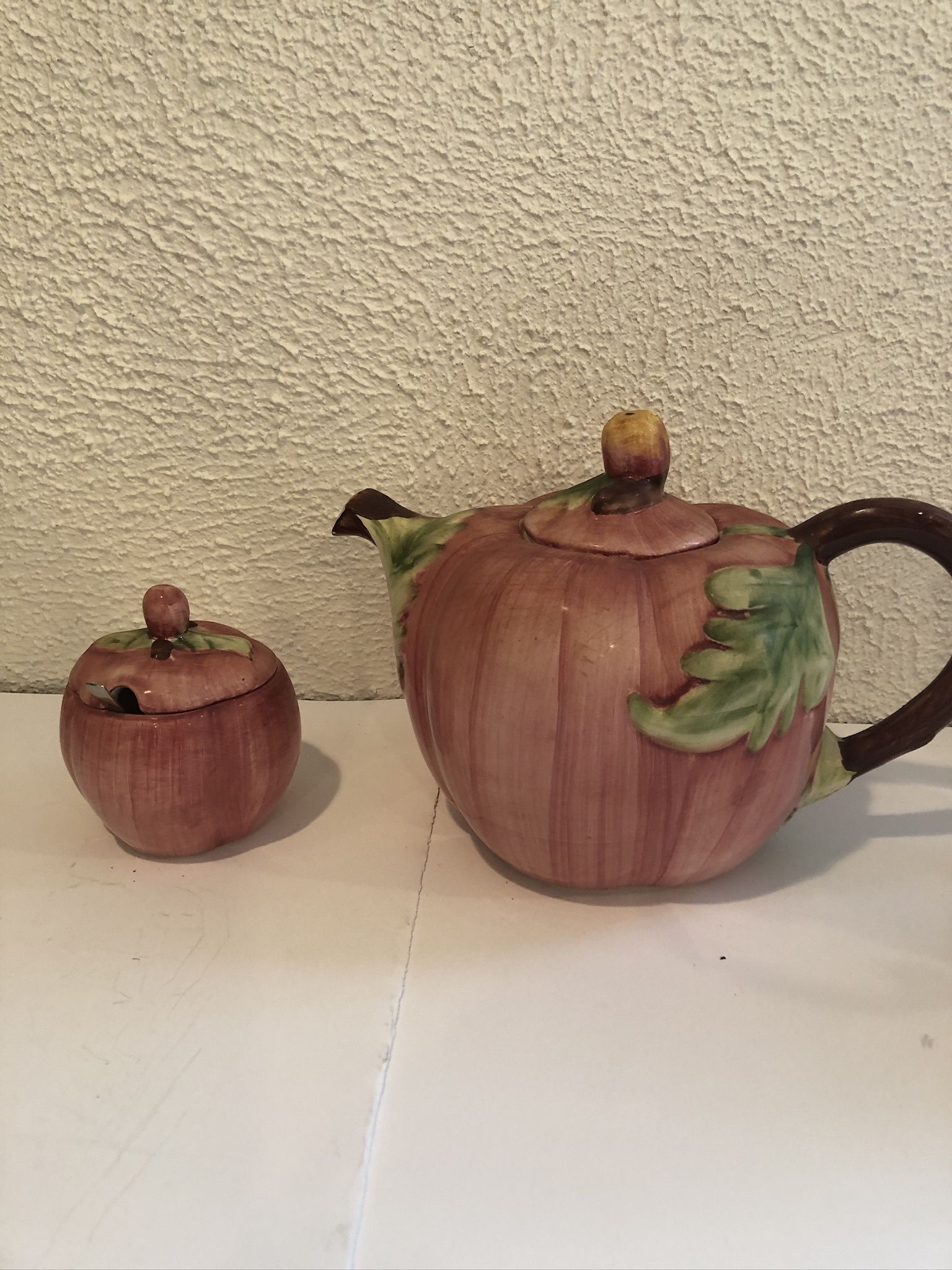 Vintage Large Apple Shaped Hand Painted Tea Pot With Sugar Bowl , Made In Portugal This is from 1950’s hand painted from Portugal , about 8” tall an